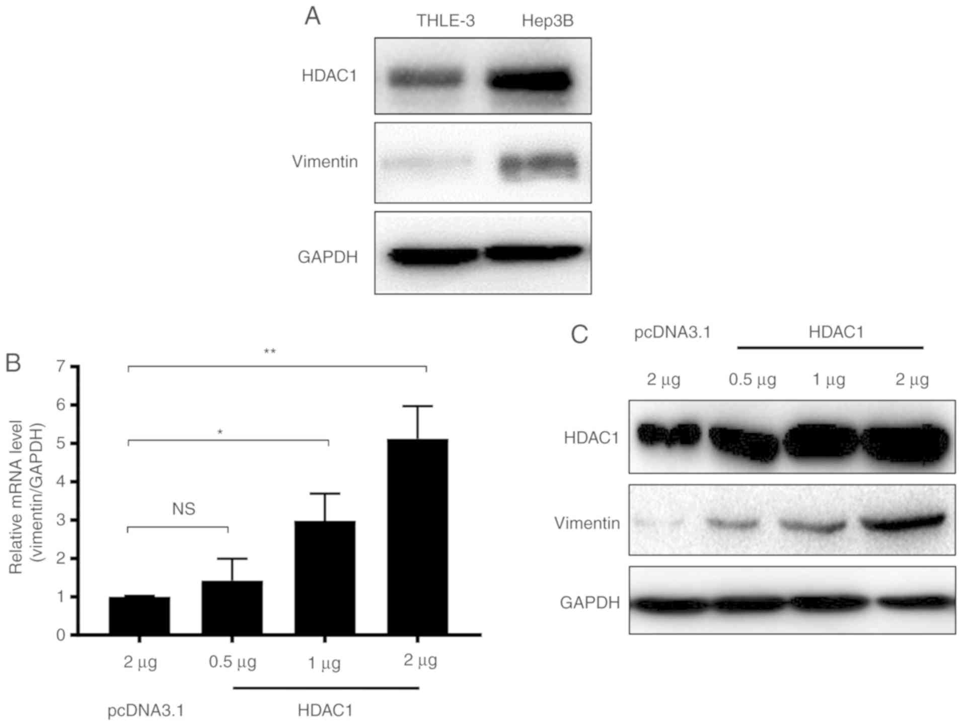 To further investigate whether vimentin expression was associated with HDAC1 expression, THLE-3 cells were transfected with increasing quantities of HDAC1, and the mRNA and protein levels of vimentin were measured. Vimentin mRNA expression levels were increased significantly when ≥1 µg of HDAC1 was transfected (P<0.05; Fig. 1B). Western blotting demonstrated that vimentin protein expression levels were additionally increased in an HDAC1 dose dependent manner (Fig. 1C). Together, these data suggested that HDAC1 and vimentin are increased in HCC cells, and HDAC1 expression may upregulate vimentin expression.