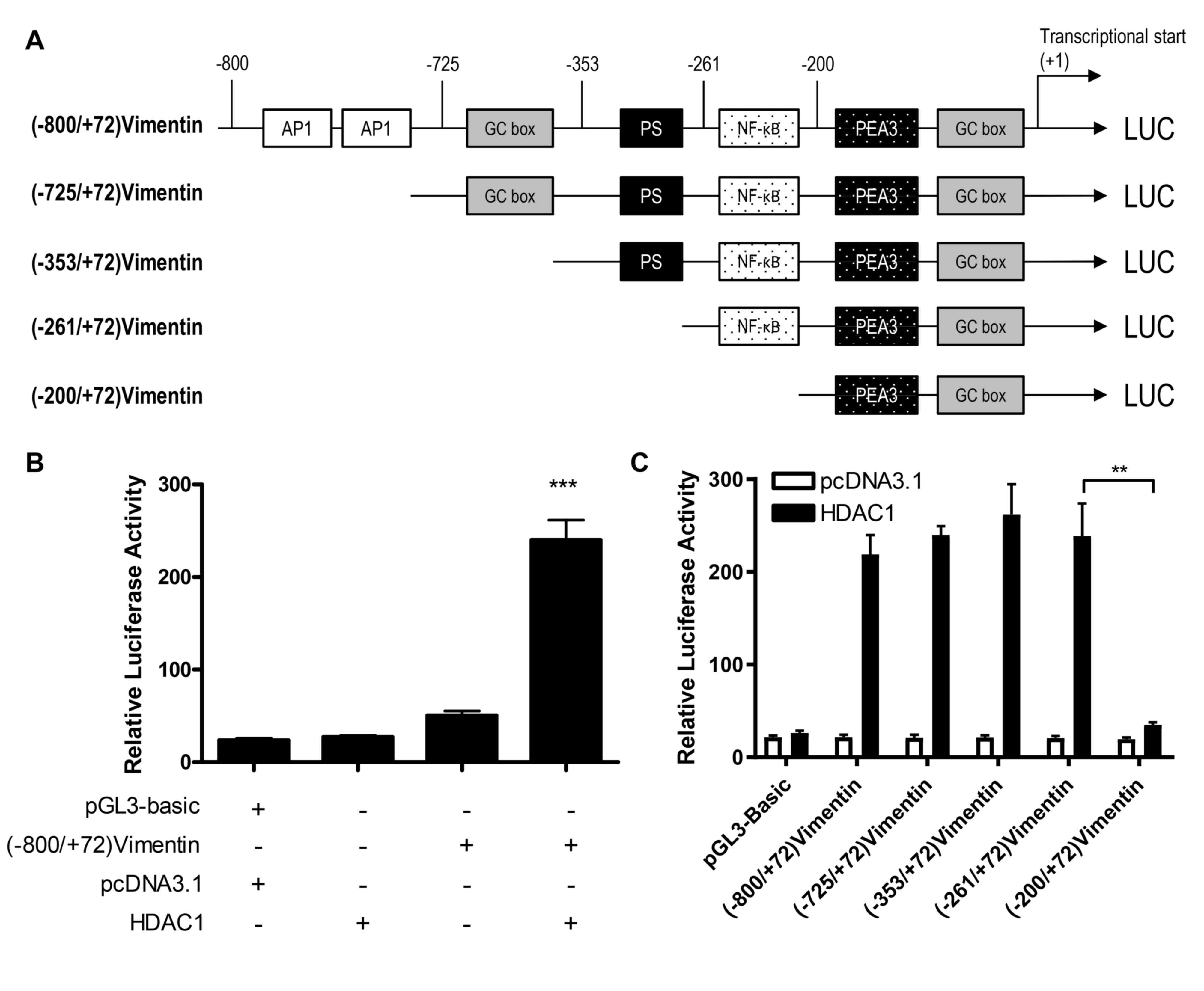To determine whether HDAC1 upregulated vimentin expression through the transactivation of a vimentin promoter, luciferase reporter gene plasmids were constructed with gene expression under the control of a full length or a 5-flanking region of a truncated vimentin promoter sequence (Fig. 2A), and the activation of these plasmids by HDAC1 was determined. HDAC1 overexpression significantly activated the vimentin promoter (P<0.001 vs. pcDNA3.1; Fig. 2B). Through the use of truncation mutants, it was demonstrated that HDAC1-mediated activation of the vimentin promoter was abrogated when the sequence between −261 and −200 was removed; suggesting that the sequence in this region was necessary for HDAC1 induced activation (Fig. 2C).