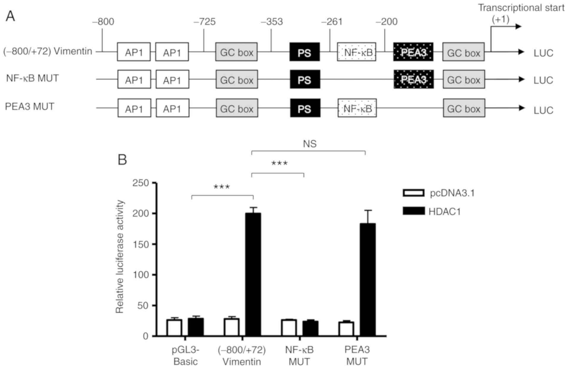Human HDAC1, p65 and p50 gene sequences were amplified from human cDNA library and subcloned into a pcDNA3.1(+) vector (Thermo Fisher Scientific, Inc.). Gene sequences were verified by Sanger sequencing. The control Renilla luciferase reporter gene plasmid and the firefly luciferase reporter gene vector pGL3-Basic were purchased from Promega Corporation, (Madison, WI, USA). The vimentin promoter sequence was amplified from the genome of THLE-3 cells, subcloned into pGL3-Basic and termed ‘(−800/+72)Vimentin’. Vimentin promoter truncations and mutations at the NF-κB and PEA3 binding sites were performed on the full length (−800/+72)Vimentin and termed ‘(−725/+72)Vimentin’, ‘(−353/+72)Vimentin’, ‘(−261/+72)Vimentin’, (−200/+72)Vimentin, NF-κB MUT and PEA3 MUT, respectively. The sequences of the primers used for plasmid construction are listed in Table I. HDAC1 siRNA (cat. no. sc-29343) and control siRNA (cat. no. sc-37007) were purchased from Santa Cruz Biotechnology, Inc. (Dallas, TX, USA).