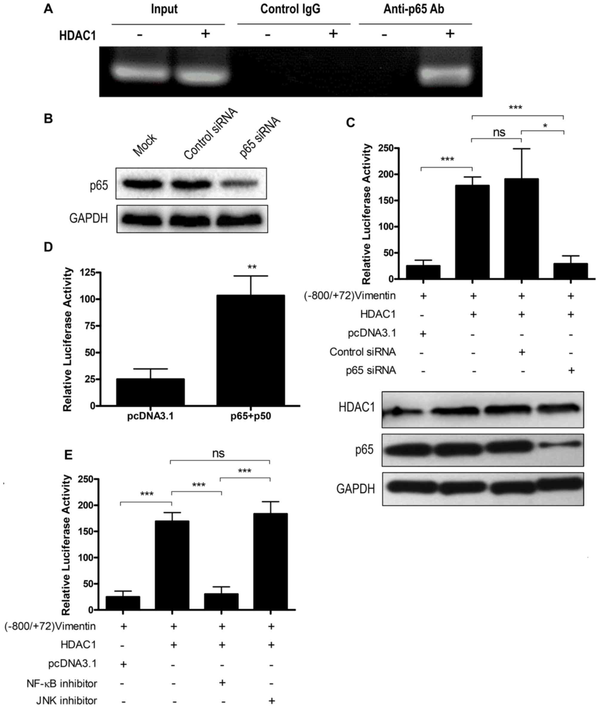 To determine whether HDAC1 overexpression could promote NF-κB binding with the vimentin promoter, a ChIP assay was performed. The vimentin promoter sequence was not pulled down by an anti-p65 antibody when HDAC1 was not overexpressed. However, following HDAC1 overexpression, the vimentin promoter sequence was detected in the anti-p65 antibody pull-down, indicating that HDAC1 overexpression could result in the binding of NF-κB with the vimentin promoter (Fig. 4A). The control immunoglobulin G antibody did not result in a pull-down of the vimentin promoter sequence irrespective of HDAC1 expression (Fig. 4A).