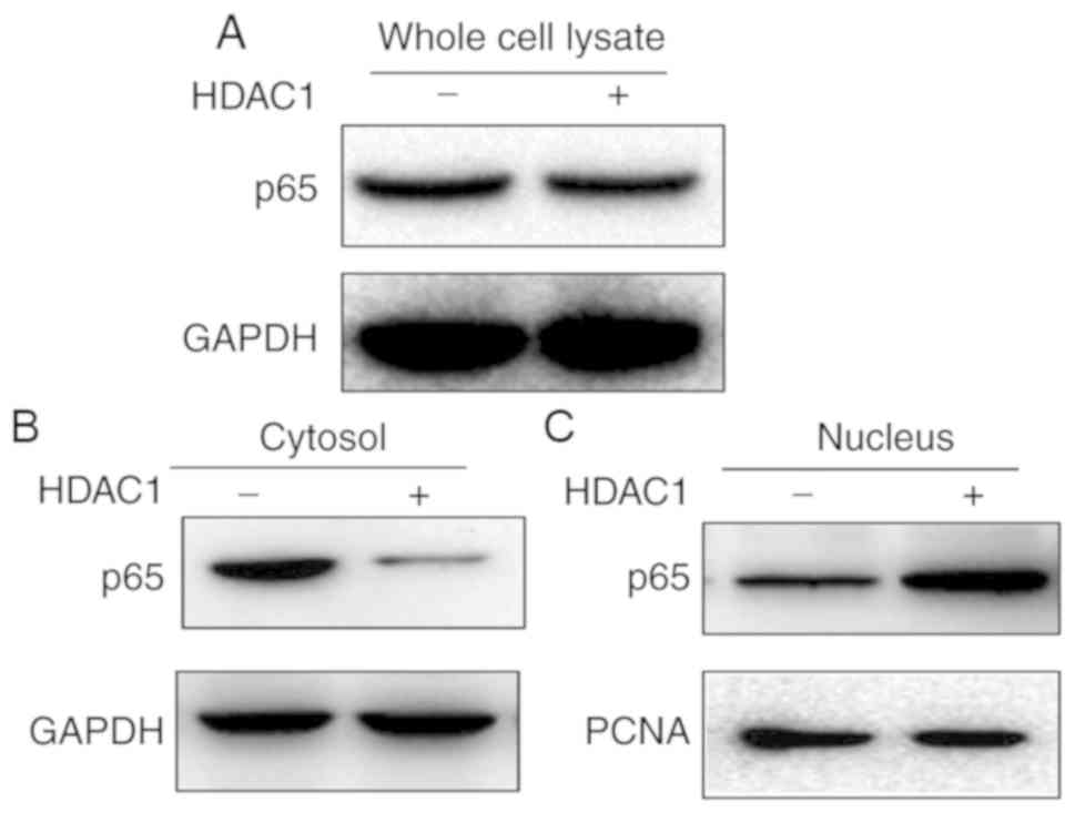 For analysis using whole cell lysate, cells were harvested and lysed using lysis buffer (Thermo Fisher Scientific, Inc.) supplemented with protease inhibitors (Roche Applied Science, Penzberg, Germany), and mixed with SDS-PAGE loading buffer. For analysis using cytoplasmic and nuclear fractions, prepared fractions were mixed with SDS-PAGE loading buffer directly. Protein concentration was quantified using the Pierce BCA Protein Assay kit (Thermo Fisher Scientific, Inc.) and 20 µg whole cell lysate or 10 µg cytoplasmic and nuclear fractions were separated using a 12% SDS-PAGE gel and transferred onto a PVDF membrane. GAPDH was used as a loading control. Non-specific binding sites on the membrane were blocked with 5% skimmed milk for 1 h at room temperature. The membrane was sequentially incubated with primary and corresponding horseradish peroxidase (HRP)-conjugated secondary antibodies for 2 and 1 h at room temperature, respectively. After extensive washes, immunobands were visualized using ECL substrate (Merck KGaA, Darmstadt, Germany,) under a charge-couple device camera (Bio-Rad Laboratories, Inc., Hercules, CA, USA). The following primary antibodies were used in this study: Anti-HDAC1 antibody (cat. no. ab19845; Abcam, Cambridge, UK), anti-p65 antibody (cat. no. sc-372; Santa Cruz Biotechnology, Inc.), anti-vimentin antibody (cat. no. ab92547; Abcam) and anti-GAPDH antibody (cat. no. g8795; Sigma-Aldrich; Merck KGaA). HRP-conjugated secondary antibodies [Goat Anti-Mouse IgG (H+L)-HRP; cat. no. BA1050 and Goat Anti-Rabbit IgG (H+L)-HRP; cat. no. BA1056] were both obtained from Wuhan Boster Biological Technology, Ltd., (Wuhan, China). All the primary antibodies were used at a 1:1,000 dilution, and all the secondary antibodies were used at a 1:100,000 dilution.