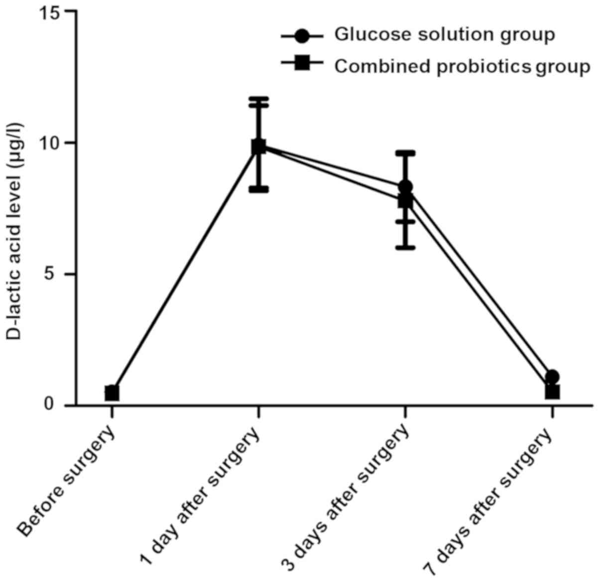 The endotoxin level was increased compared with that before surgery in both groups and was increased more significantly in the glucose solution group than that in the combined probiotics group. Τhere were statistically significant differences at 1 and 3 days after surgery between the two groups (P<0.05). The IGF-I level was decreased in both groups and declined more significantly in the combined probiotics group than that in the glucose solution group. Τhere were statistically significant differences at 1, 3 and 7 days after surgery between the two groups. The above results indicate that the preoperative application of glucose combined with postoperative supplement of probiotics can inhibit the decline in IGF-I, accelerate the removal of endotoxin and protect the intestinal mucosal barrier function (Table I).