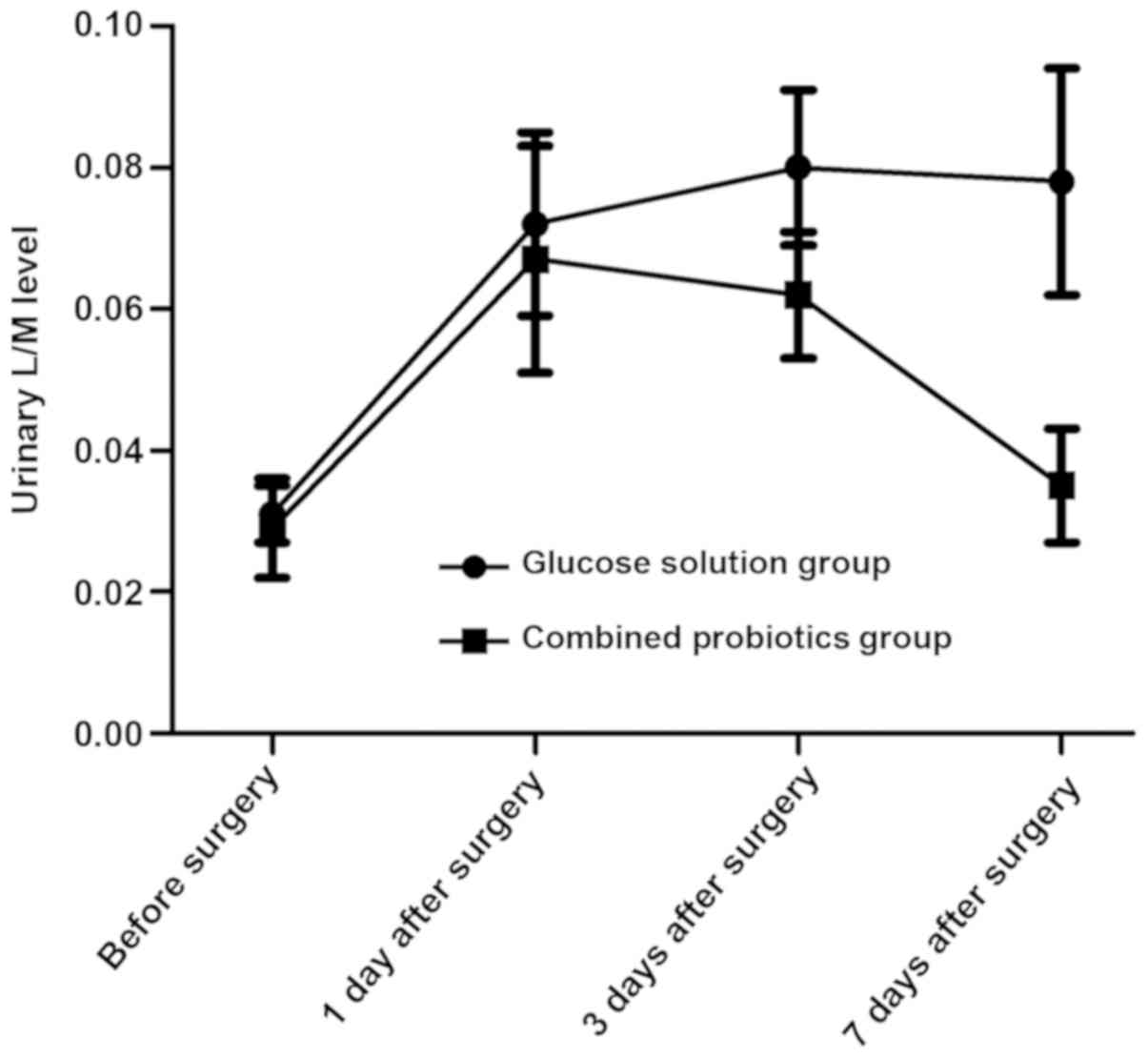 The serum D-lactic acid and urinary L/M levels were increased first and then decreased after surgery in both groups, and they declined more obviously in the combined probiotics group than those in the glucose solution group. Differences were statistically significant at 7 days after surgery between the two groups (P<0.05). The above results suggest that probiotics are beneficial in reducing intestinal mucosal damage and permeability (Figs. 1 and 2).