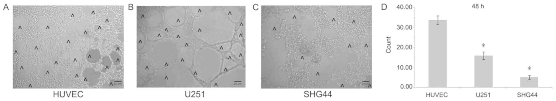 In order to better detect the angiogenesis of different tumor cells, this study carried out a 3D cell culture. In vitro 3D culture demonstrated that the number of cavity structures in U251 cells notably increased compared with that in SHG44 cells, but was significantly lower compared with HUVECs (Fig. 4A-D).