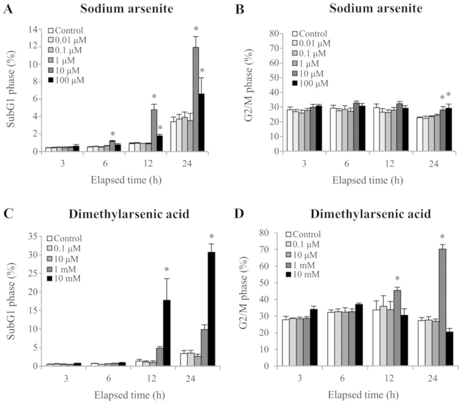 To determine whether MA10 cells were undergoing apoptosis following treatment with arsenic compounds, cell DNA content was quantified using PI staining. A significant increase in the number of cells in the sub-G1 phase, which is an apoptotic marker, was observed following 12 and 24 h treatment with 10 µM sodium arsenite or 10 mM DMA, respectively (P<0.05; Fig. 2A and C). In addition, the cell population in the G2/M phase was significantly increased following 24 h treatment with 10 and 100 µM sodium arsenite, and 12 h treatment with 1 mM DMA (12 and 24 h), which indicated that both arsenic compounds caused G2/M cell cycle arrest of MA10 cells (Fig. 2B and D) (P<0.05). These results suggested that cell cycle regulation and redistribution may be involved in sodium arsenite- and DMA-induced MA-10 cell apoptosis.
