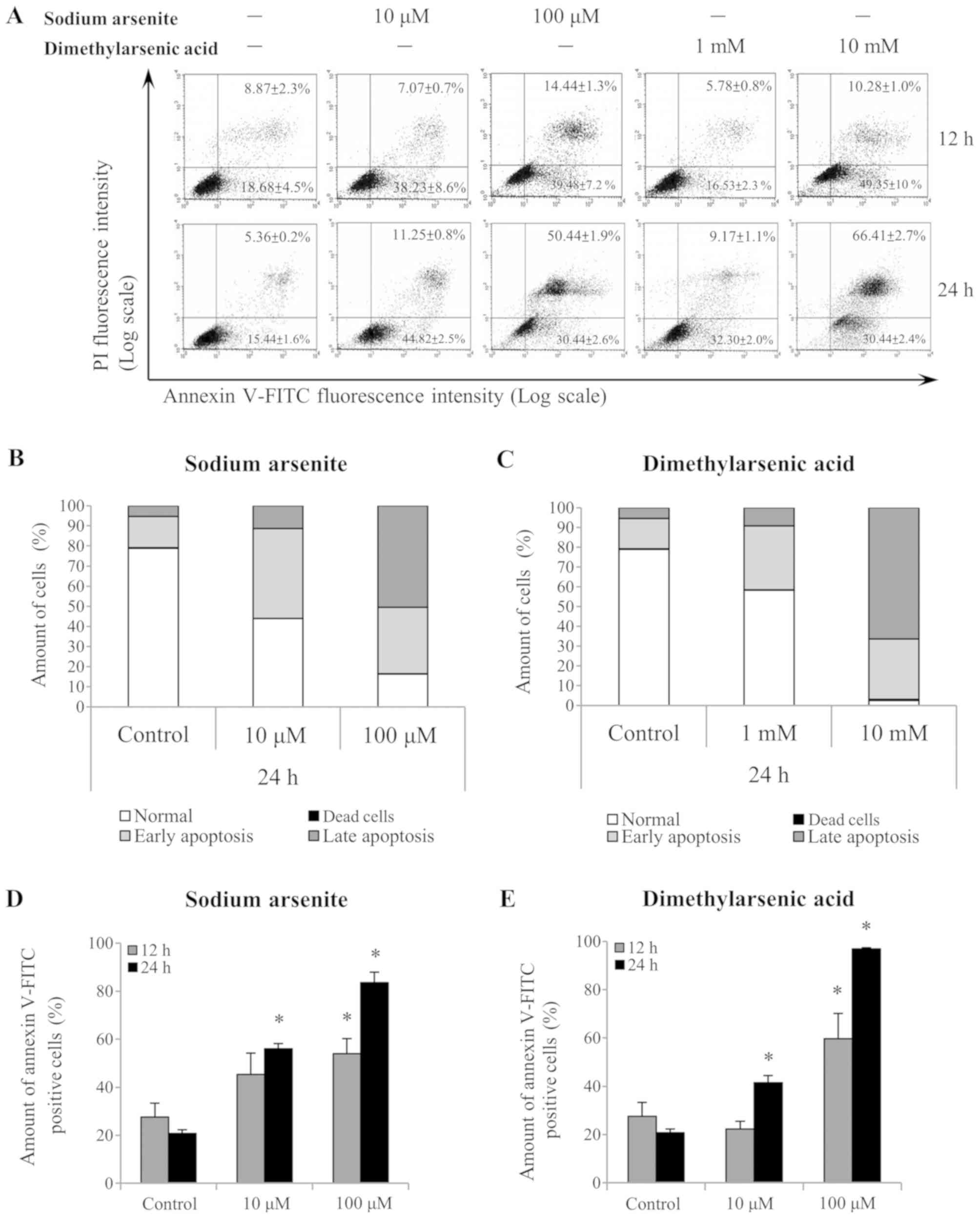 A total of 6×106 MA-10 cells were seeded in a 60-mm dish and treated 1 day after seeding with 10 or 100 µM sodium arsenite, 1 or 10 mM dimethylarsenic acid or PBS in the medium containing 1% FBS for 24 h. Treated-MA-10 cells were collected using trypsin and centrifuged at 120 × g for 10 min at 4°C, and then incubated with 100 µl Annexin V-FITC staining solution (apoptosis detection kit; Strong Biotech Corporation, Taipei, Taiwan) for 15 min at room temperature according to the manufacturer's protocol. Samples were analyzed on a FACSCalibur flow cytometer (Becton-Dickinson and Company) with an excitation wavelength of 488 nm and band pass filters of 515 and 600 nm for FITC and PI detection, respectively. Data were represented using histogram plots gated into four quadrants containing negative (Annexin V/PI), PIpositive (Annexin V/PI+), Annexin Vpositive (Annexin V+/PI) and Annexin V/PIdoublepositive (Annexin V+/PI+) stained cells, which corresponded to viable, dead, early apoptotic and late apoptotic cells, respectively (30).