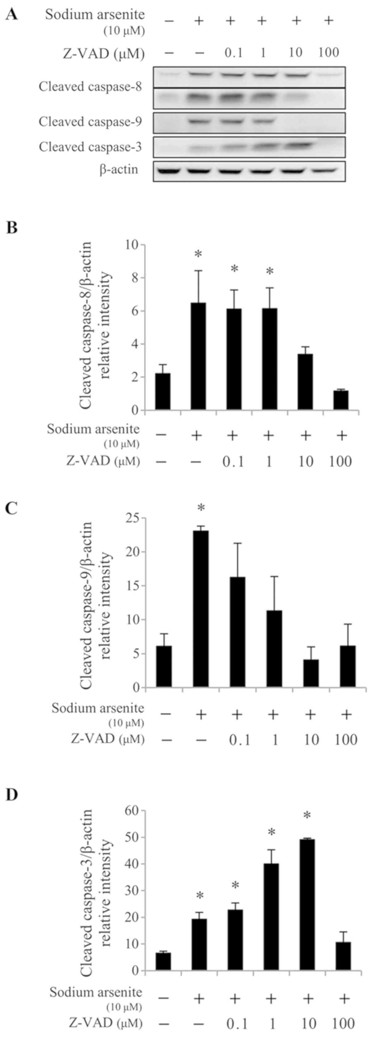 Sodium arsenite was purchased from Fluka (St. Gallen, Switzerland). DMA, RNase A, Waymouth's MB 752/1 medium, propidium iodide (PI), Folin & Ciocalteu's phenol reagent, EDTA, EGTA, 30% acrylamide/Bisacrylamide solution, MTT and anti-β-actin monoclonal antibody were purchased from Sigma-Aldrich; Merck KGaA (Darmstadt, Germany). Fetal bovine serum (FBS) and trypsin-EDTA were purchased from Gibco; Thermo Fisher Scientific, Inc. (Waltham, MA, USA). Gentamycin sulfate was purchased from AG Scientific Inc. (San Diego, CA, USA). Sodium chloride (NaCl), HEPES, potassium chloride and Tris base were purchased from J.T. Baker (Phillipsburg, NJ, USA). Disodium hydrogen phosphate, potassium dihydrogen phosphate, and tissue culture grade sodium bicarbonate were purchased from Riedel-de Haën (Seelze, Germany). Hydrochloric acid, sodium dodecyl sulfate (SDS), Tween-20 and dimethyl sulfoxide (DMSO) were purchased from Merck KGaA. Sucrose was purchased from Panreac (Barcelona, Spain). The general caspase inhibitor Z-VAD-fmk was purchased from R&D Systems, Inc. (Minneapolis, MN, USA). Goat horseradish peroxidase (HRP)-conjugated anti-rabbit immunoglobulin (Ig)G (cat. no. NEF812001EA; 1:2,000) and HRP-conjugated antimouse IgG secondary antibodies (cat. no. NEF822001EA; 1:2,000) were purchased from PerkinElmer, Inc. (Waltham, MA, USA). The Annexin V-fluorescein isothiocyanate (FITC) apoptosis detection kit was purchased from Strong Biotech (Taipei, Taiwan). Polyclonal antibodies against cleaved caspases-3 (cat. no. 9661; 1:2,000), cleaved caspase-8 (cat. no. 9429; 1:2,000) and cleaved caspase-9 (cat. no. 9509; 1:2,000) and poly(ADP-ribose) polymerase (PARP; cat. no. 9542; 1:2,000) were purchased from Cell Signaling Technology, Inc. (Danvers, MA, USA). The enhanced chemiluminescence (ECL) detection kit was purchased from EMD Millipore (Billerica, MA, USA).