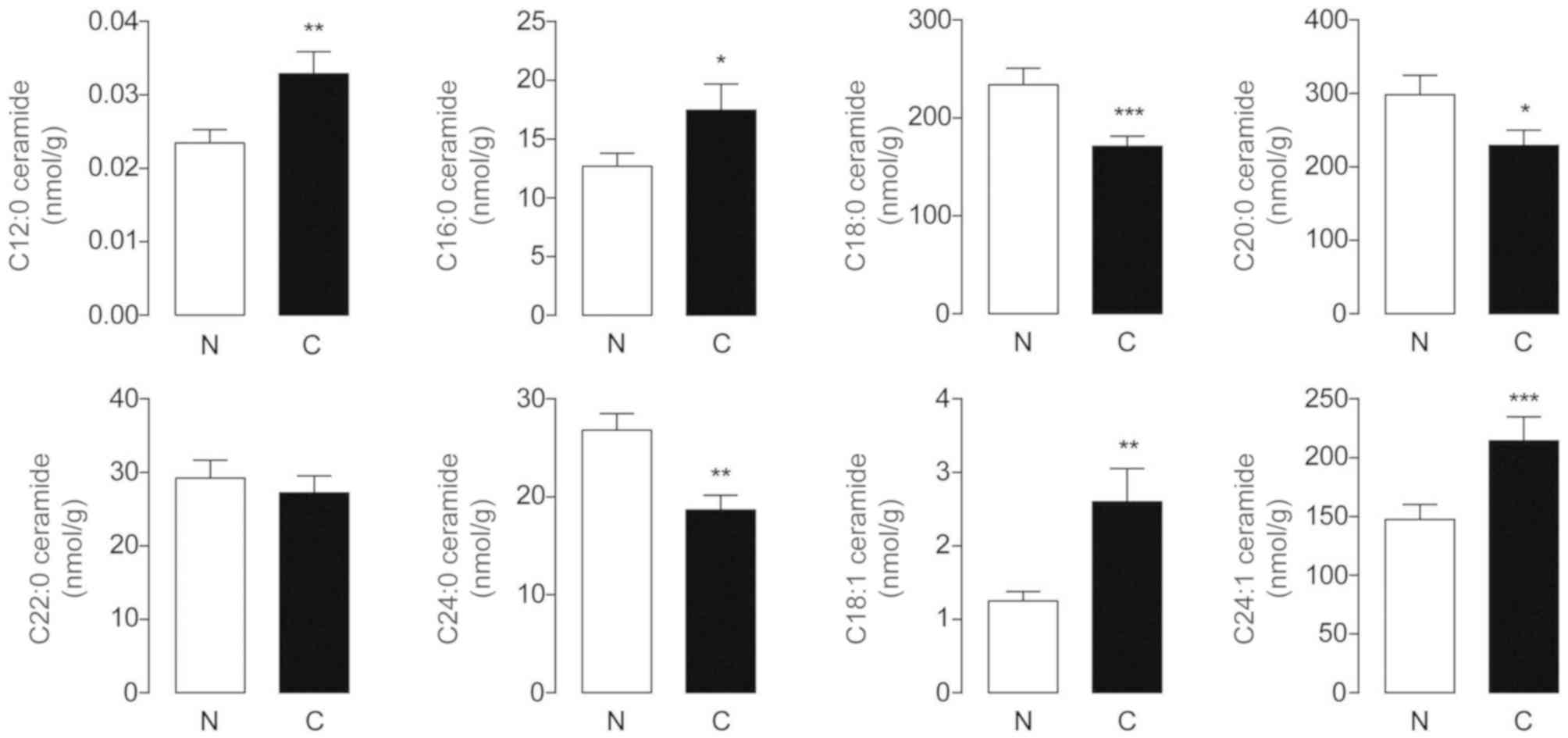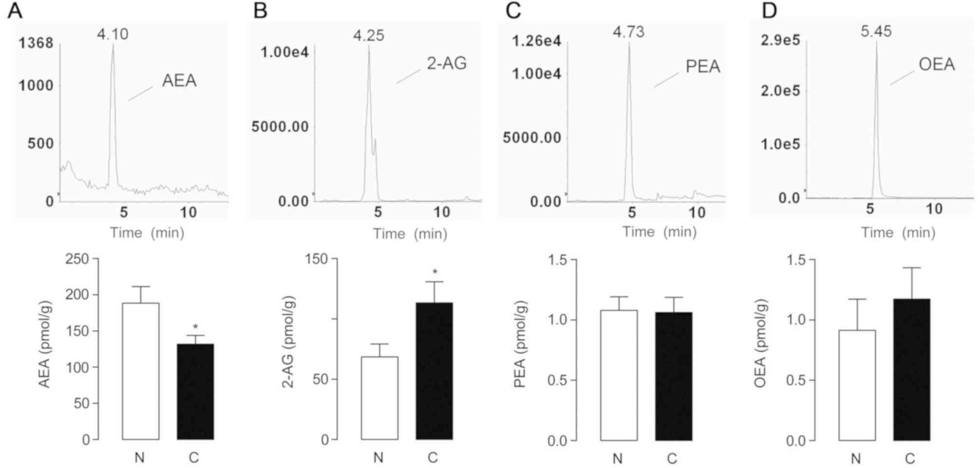 The primers were as follows: N-acylphosphatidylethanolamine-hydrolysingphospholipase D (NAPE-PLD), forward primer (F): 5′-TGGCTGGGACACGCG-3′, reverse primer (R): 5′-GGGATCCGTGAGGAGGATG-3′; fatty acid amide hydrolase (FAAH), F: 5′-GCCTCAAGGAATGCTTCAGC-3′, R: 5′-TGCCCTCATTCAGGCTCAAG-3′; monoacylglycerol lipase (MAGL), F: 5′-CATGTGGATTCCATGCAGAAAG-3′, R: 5′-AGGATTGGCAAGAACCAGAGG-3′; diacylglycerol lipase (DGL)-α, F: 5′-AGAATGTCACCCTCGGAATGG-3′, R: 5′-GTGGCTCTCAGCTTGACAAAGG-3′; CB1, F: 5′-AGCCTCTGGATAACAGCATGG-3′, R: 5′-AATCTTGACCGTGCTCTTGATG-3′; CB2, F: 5′-CTCAGTGACCAGGTCAAGAAGG-3′, R: 5′-TTTTGCCTCTGACCCAAGG-3′; ceramide synthases (Cer)S1, F: 5′-TTTGGCTCCCGCACAATGT-3′, R: 5′-AAAAGCGAGATAGAGGTCCTCA-3′; CerS2, F: 5′-GCTCTTCCTCATCGTTCGATAC-3′, R: 5′-GTGTAGCCACGTACAGCTCA-3′; CerS3, F: 5′-CACCCAGCTGTCAAAGAGAAGG-3′, R: 5′-AGGACGATATCCGAAAGGTGG-3′; CerS4, F: 5′-CCGGATCCCGTCCAGTTTCAACGAG-3′, R: 5′-GGGAATTCGGCTATGTGGCTGTTGTG-3′; CerS5, F: 5′-GCTGCTCTTCGAGCGATTTAT-3′, R: 5′-CCTCCGATGGCGAAACCAG-3′; CerS6, F: 5′-TTTGGCTCCCGCACAATGT-3′, R: 5′-AAAAGCGAGATAGAGGTCCTCA-3′; 18S, F: 5′-CAGCCACCCGAGATTGAGCA-3′, R: 5′-TAGTAGCGACGGGCGGTGTG-3′.