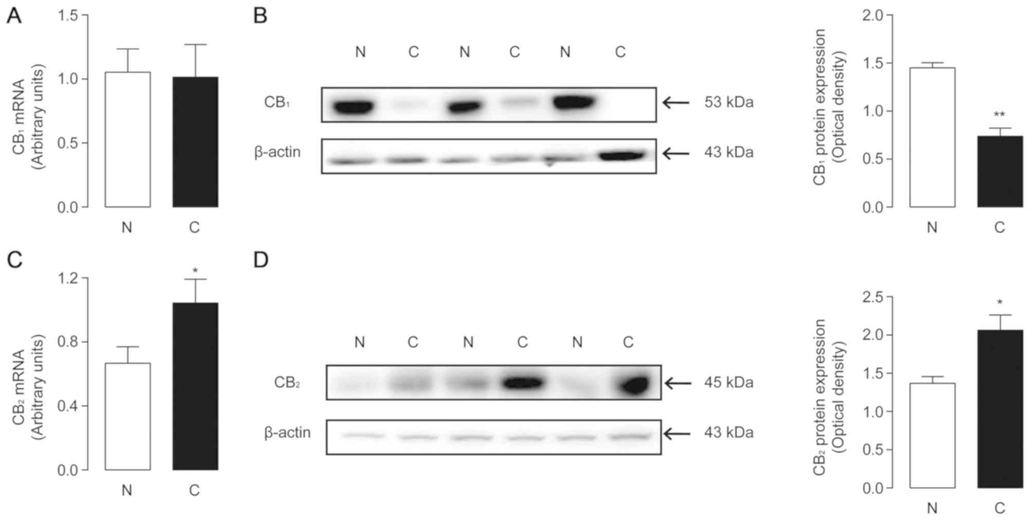 It has been reported that cannabinoid receptors 1 and 2 mediate functional responses to the AEA and 2-AG. As the levels of these two endocannabinoids changed significantly in tumor tissues, the present study investigated whether there were corresponding changes in the receptors. The mRNA expression of CB1 and CB2 was examined by quantitative PCR in both tumor and non-tumor samples. There was no significant difference between the two groups for CB1 mRNA levels (Fig. 3A), while CB2 expression was increased in tumor tissues (Fig. 3C). The protein levels of the two receptors were further investigated via western blot analysis. ImageJ software was used to calculate the optical density of the blots, using β-actin as the control. The results revealed that CB1 protein levels in tumor tissues were decreased significantly (1.45±0.054 in non-cancerous tissues and 0.74±0.086 in tumor tissues; P=0.0022; Fig. 3B), and those of CB2 were significantly increased (1.37±0.088 in non-tumor tissues and 2.06±0.2 in tumor tissues; P=0.0336, Fig. 3D). The trends in receptor protein expression were consistent with the changes in endogenous ligands.