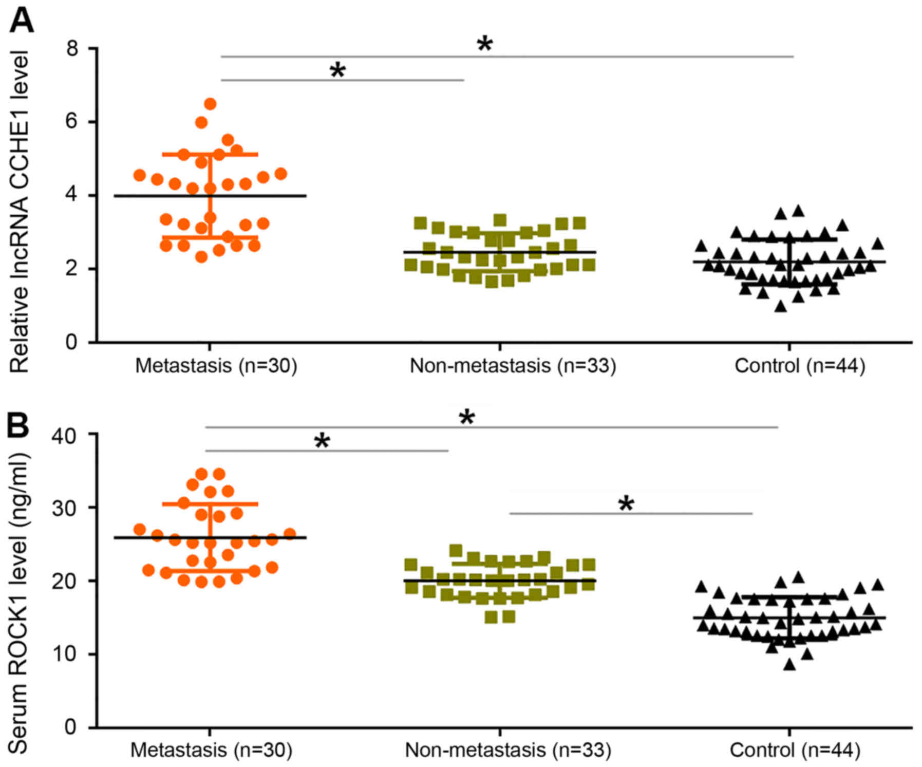 Compared with in patients with non-metastatic pancreatic adenocarcinoma and healthy controls, the expression levels of CCHE1 (Fig. 1A) and ROCK1 (Fig. 1B) were significantly increased in patients with metastatic pancreatic adenocarcinoma (P<0.05). In addition, serum levels of ROCK1 were significantly higher in patients with non-metastatic pancreatic adenocarcinoma compared with in healthy controls.