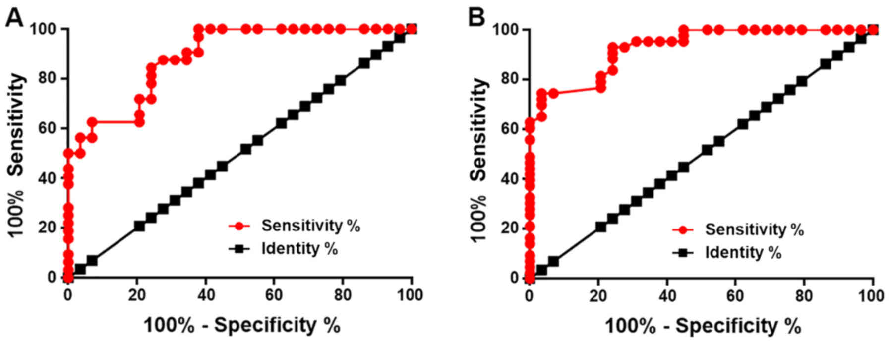 Selecting patients with non-metastatic pancreatic adenocarcinoma and healthy controls as true negative cases and patients with metastatic pancreatic adenocarcinoma as true positive cases, the diagnostic value of lncRNA-CCHE1 for metastatic pancreatic adenocarcinoma was evaluated by ROC curve analysis (Fig. 2). With healthy controls as true negative cases, the area under the curve (AUC) was 0.8895 (standard error, 0.03976; 95% confidence interval, 0.8116–0.9675; P<0.0001). With patients with non-metastatic pancreatic adenocarcinoma as true negative cases, AUC was 0.9282 (standard error, 0.02801; 95% confidence interval, 0.8733–0.9831; P<0.0001).