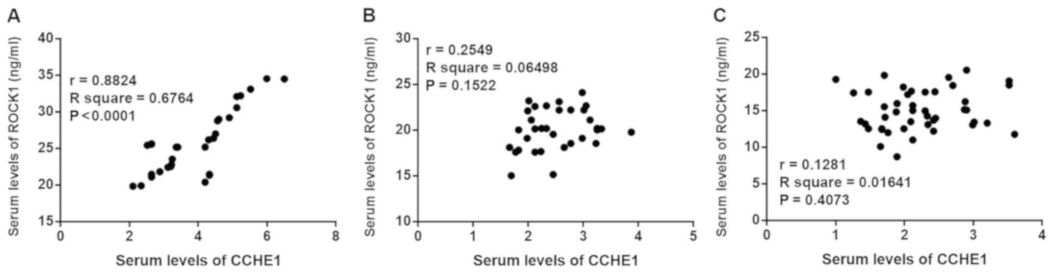 Pearson correlation analysis revealed a significantly positive correlation between serum levels of CCHE1 and ROCK1 in patients with metastatic pancreatic adenocarcinoma (Fig. 3A). However, the correlation between serum levels of CCHE1 and ROCK1 was not identified to be significant in patients with non-metastatic pancreatic adenocarcinoma (Fig. 3B) or in healthy controls (Fig. 3C).