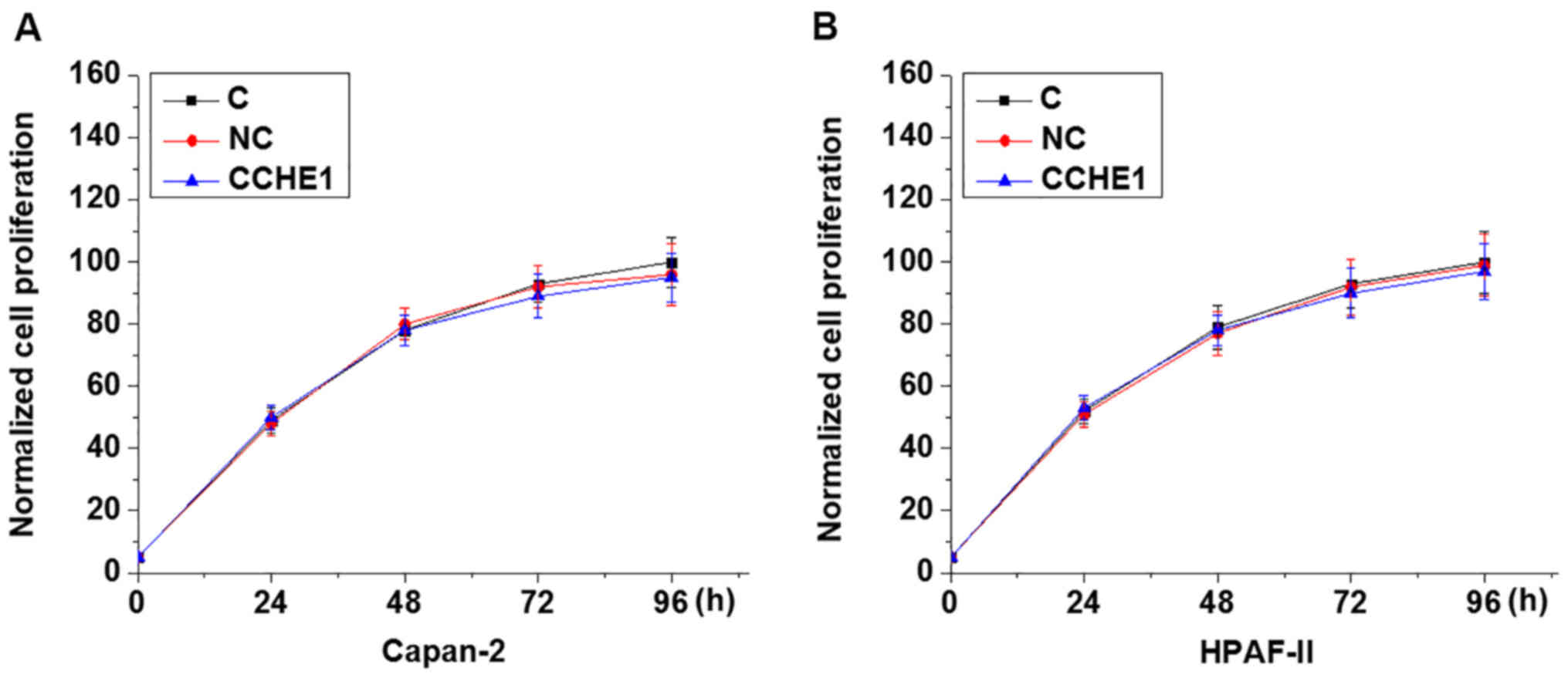 In the present study, Capan-2 and HPAF-II cell lines were used to perform CCHE1 and ROCK1 overexpression experiments. To investigate the role of lncRNA-CCHE1 in the proliferation of pancreatic adenocarcinoma cells, proliferation of Capan-2 and HPAF-II cells was detected by CCK-8 assay following transfection with lncRNA-CCHE1 expression vectors. As shown in Fig. 4, compared with the control and negative control groups, lncRNA-CCHE1 overexpression did not significantly affect the proliferation of Capan-2 and HPAF-II cells.