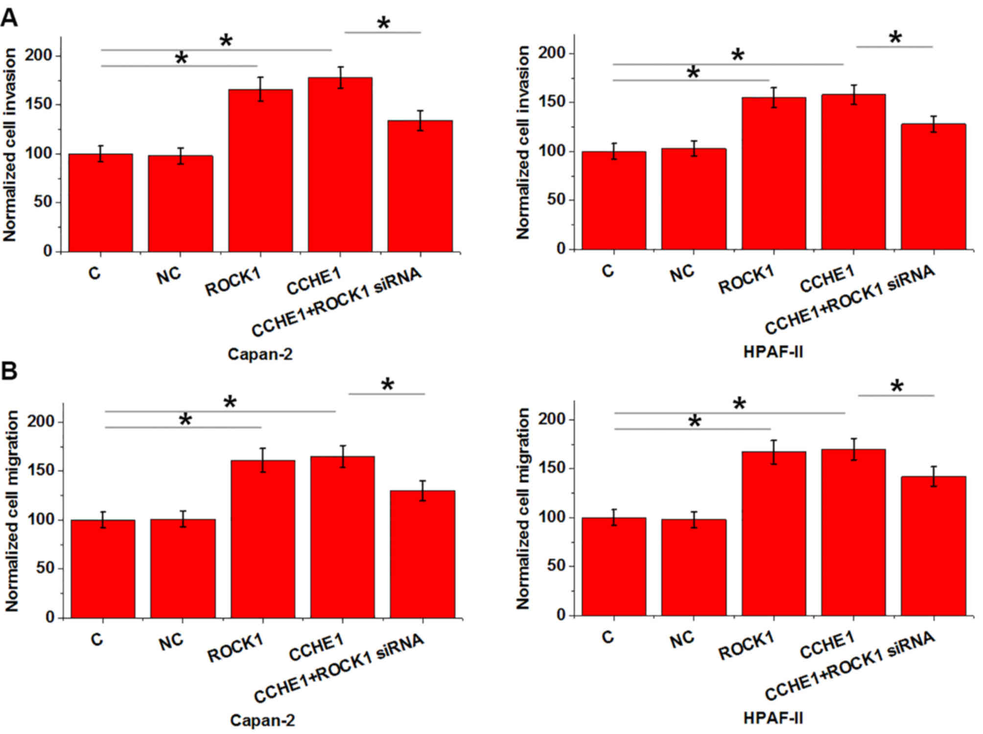 ROCK1 is involved in cancer biology mainly by regulating cancer cell motility and tumor metastasis (10). Upregulation of ROCK1 has been observed in various types of cancer, including pancreatic cancer (18,19). Consistent with previous studies, the results of the present study demonstrated upregulation of serum ROCK1 in patients with pancreatic adenocarcinoma, compared with in healthy controls. ROCK1 signaling in cancer biology is transduced via interactions with different signaling molecules, inducing lncRNAs (20,21). The present study revealed a significant correlation between lncRNA-CCHE1 and ROCK1 in patients with metastatic pancreatic adenocarcinoma. Additionally, lncRNA-CCHE1 was suggested to be an upstream activator of ROCK1 signaling in the regulation of migration and invasion of pancreatic adenocarcinoma cells. Notably, although serum levels of ROCK1 were upregulated in patients with non-metastatic pancreatic adenocarcinoma, no significant correlation between serum levels of lncRNA-CCHE1 and ROCK1 was observed among those patients. ROCK1 signaling may interact with multiple functional molecules in pancreatic adenocarcinoma and the crosstalk between ROCK1 and lncRNA-CCHE1 may only occur at late stages. Besides ROCK1, lncRNA-CCHE1 may also interact with other signaling molecules to regulate pancreatic adenocarcinoma cell migration and invasion, since ROCK1 siRNA knockdown only partially reversed the enhancing effects of lncRNA-CCHE1 overexpression on cancer cell migration and invasion. Notably, CCHE1 siRNA transfection was also performed, but the knockdown rate was <60%. No significant alterations in cell migration and invasion were identified following transfection (data not shown). This may be due to the low knockdown efficacy of CCHE1, or that CCHE1 knockdown has no marked effect on cancer cell migration and invasion. Future studies will try to improve the knockdown efficacy by evaluating the effects of additional siRNAs.
