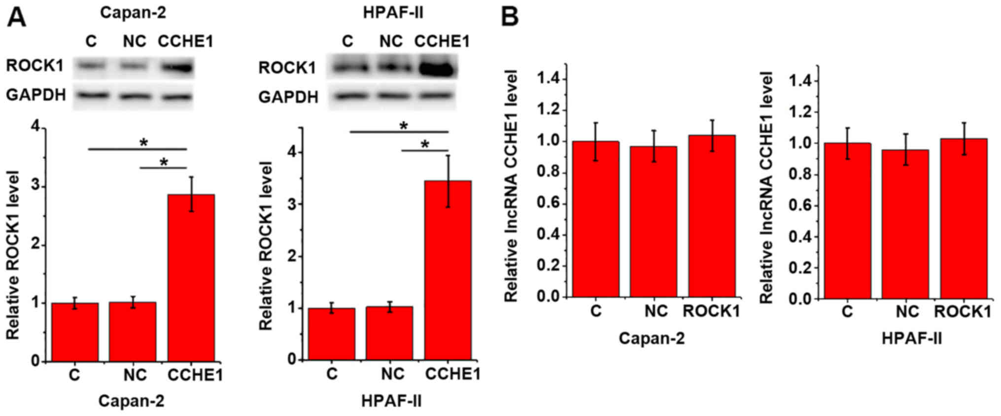 To investigate the potential interaction between lncRNA-CCHE1 and ROCK1, the expression levels of lncRNA-CCHE1 and ROCK1 were detected by RT-qPCR and western blotting following transfection with lncRNA-CCHE1 and ROCK1 expression vectors. Compared with in the control and negative control groups, lncRNA-CCHE1 overexpression upregulated ROCK1 expression in Capan-2 and HPAF-II cell lines (Fig. 6A; P<0.05). Conversely, in cancer cells with ROCK1 overexpression, no significantly altered expression levels of lncRNA-CCHE1 were observed (Fig. 6B; P<0.05).