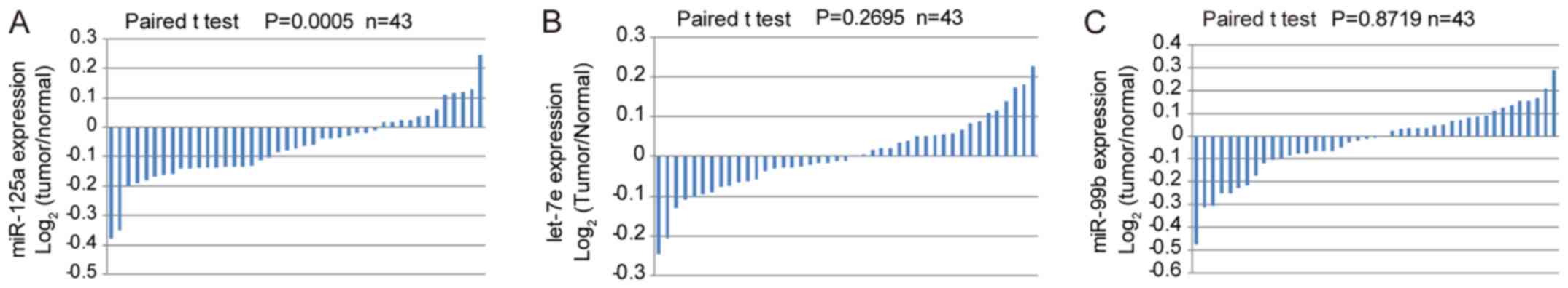 Stomach adenocarcinoma (STAD) miRNA expression data was downloaded. A total of 43 pairs of matched tumor and adjacent normal tissues were included within the TCGA-STAD dataset and were obtained using SPSS (version 18.0.0; SPSS, Inc.) software based on the sample IDs [criteria for each pair of matched samples: i) The first 13 characters of each sample ID were the same; and ii) the last two characters of each sample ID represented either primary tumor (code: 01) or solid tissue normal (code: 11)] from the TCGA database (https://cancergenome.nih.gov/). Then, the normalized expression data (level 3) of the miR-125a/let-7e/miR-99b cluster according to miRNA-seq calculated using the log2 algorithm (tumor/normal) in the selected samples were obtained, and the statistical significance between tumor and adjacent normal tissues was evaluated using a paired t-test.