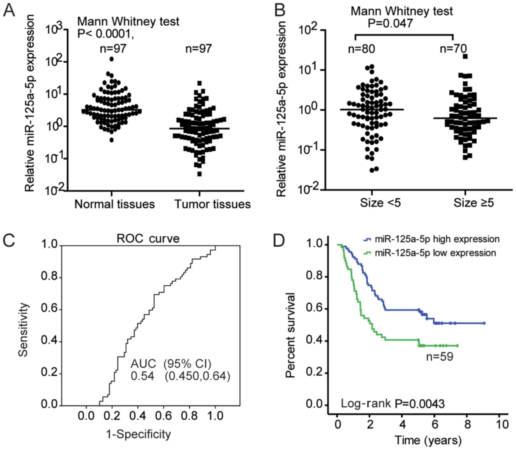 The probe sequences of miR-125a were checked in TGCA, which were matched to the chromosome 19 plus strand from 56888319-56888404. This indicates that the miR-125a expression data obtained from TCGA includes both miR-125a-3p and miR-125a-5p expression. Only the miR-125a-5p expression was analyzed in the cohort in the present study. The expression of miR-125a-3p expression in the GC tissues should be investigated in future studies.