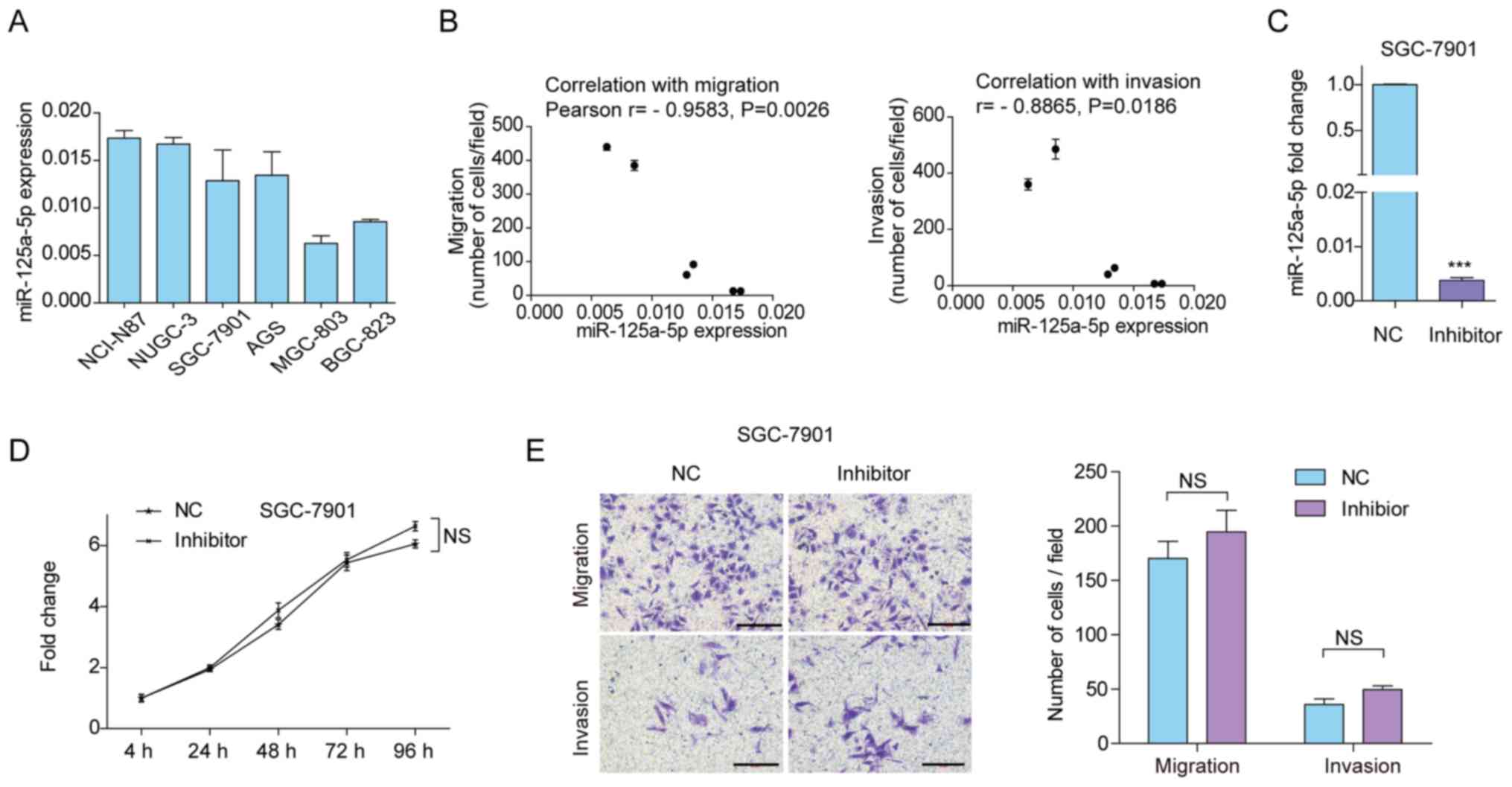 As it was hypothesized that miR-125a-5p may act as a tumor suppressor in GC, the phenotypic changes were evaluated following the downregulation of miR-125a-5p by miRNA inhibitors in SGC-7901 cells with a relatively higher endogenous expression (Fig. 3A). RT-qPCR analysis demonstrated 99.6% transfection efficiency in response to treatment using miRNA inhibitors (Fig. 3C). However, there was no significant effect on cell viability in response to treatment using miR-125a-5p inhibitors as assessed using CCK8 assay (Fig. 3D). The results of the Transwell assay demonstrated no significant changes in the migratory or invasive ability of SGC-7901 cells transfected with miR-125a-5p inhibitors and NC (Fig. 3E). These results suggest that miR-125a-5p silencing has no effect on SGC-7901 cell proliferation, migration and invasion in vitro.
