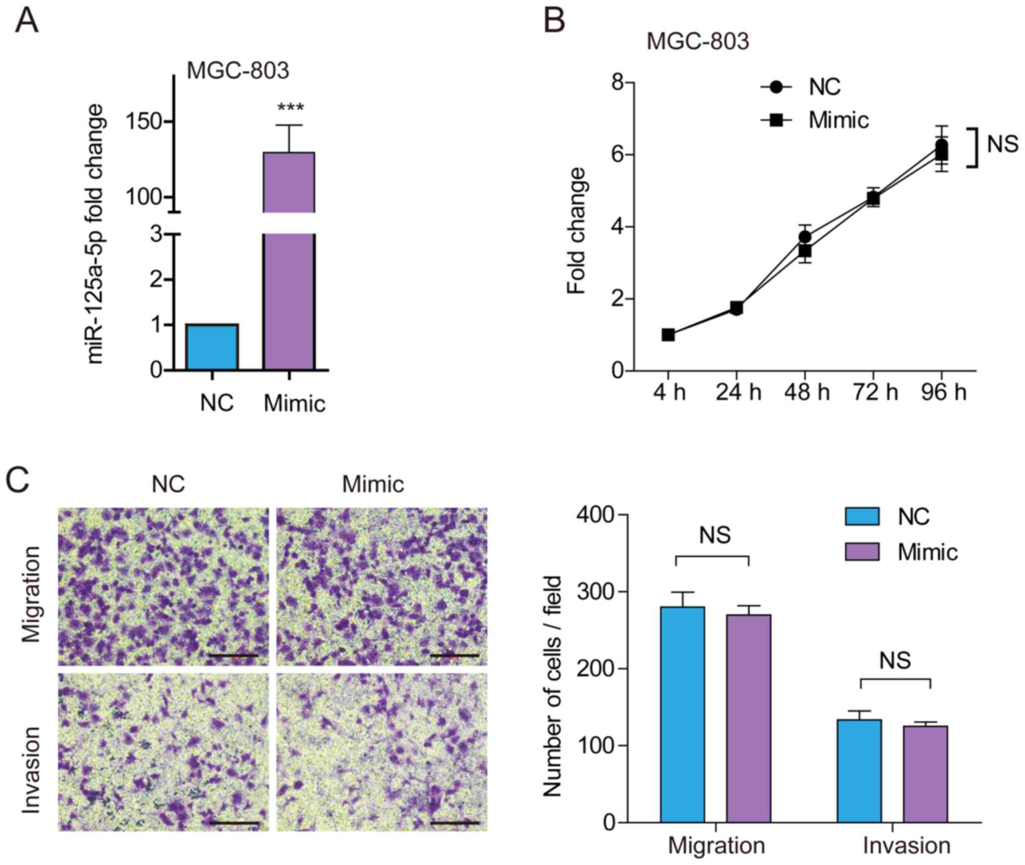 To further confirm the aforementioned results on viability and the migratory and invasive ability of GC cells, MGC-803 cells, which showed relatively lower endogenous miR-125a-5p expression among the six GC cell lines, were treated with miR-125a-5p mimics. RT-qPCR analysis demonstrated that miR-125a-5p expression was increased 129.4-fold in cells transfected with miR-125a-5p mimics (Fig. 4A). Consistently with the aforementioned results, there was no significant difference in cell viability (Fig. 4B), cell migration or invasion (Fig. 4C) in MGC-803 cells transfected with miR-125a mimics and NC. Therefore, miR-125a-5p overexpression has no effect on MGC-803 cell proliferation, migration and invasion in vitro.