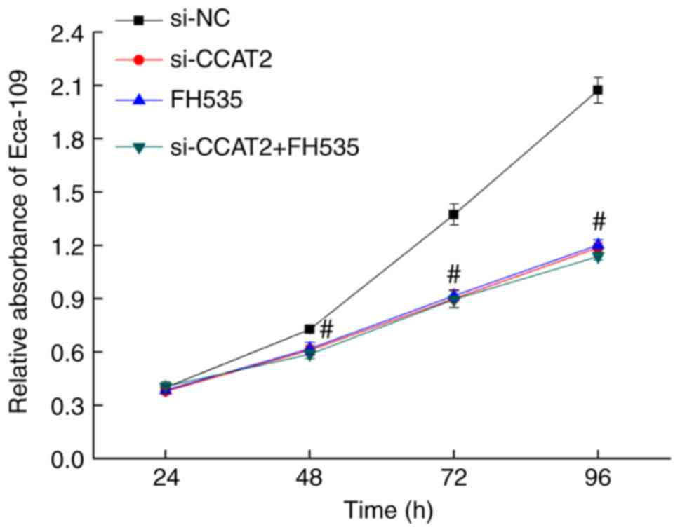 Based on the expression level of lncRNA CCAT2 in the four esophageal cancer cell lines, the Eca-109 cell line was selected for further experiments because it exhibited a higher expression level of lncRNA CCAT2 than the other three cell lines. The cells were divided into 5 groups: i) Control, no treatment; ii) negative control group (si-NC), scramble sequence transfected; iii) lncRNA CCAT2-silenced group (si-CCAT2), transfection with siRNA sequences targeting CCAT2; iv) Wnt pathway inhibitor (FH535) group, 10 µM FH535 treatment (cat. no. HY-15721; MedChemExpress); and v) CCAT2 silencing and inhibitor group (si-CCAT2 + FH535), transfection with siRNA sequence targeting CCAT2 and 10 µM FH535 treatment. The esophageal cancer Eca-109 cells were digested and passaged with 0.25% trypsin (Invitrogen; Thermo Fisher Scientific, Inc.). Cells (2×105) were inoculated on a 6-well plate. After 24 h, when the cells reached 30–50% confluence, 10 µl/250 µl siRNA was transfected with Lipofectamine® 2000 Transfection Reagent (Invitrogen; Thermo Fisher Scientific, Inc.). A further ~24 h later, the medium containing the mixture was preplaced with fresh medium containing 10% FBS. Cell transfection was assessed by reverse transcription-quantitative PCR (RT-qPCR). The sequences of the control and lncRNA CCAT2 siRNAs were as follows: si-CCAT2 sense strand, 5′-GCCUGUAGGAAGAGUCAAATT-3′; si-CCAT2 antisense strand, 5′-UUUGACUCUUCCUACAGGCTT-3′; si-NC sense strand, 5′-UUCUCCGAACGUGUCACGUTT-3′; and si-NC antisense strand, 5′-ACGUGACACGUUCGGAGAATT-3′.