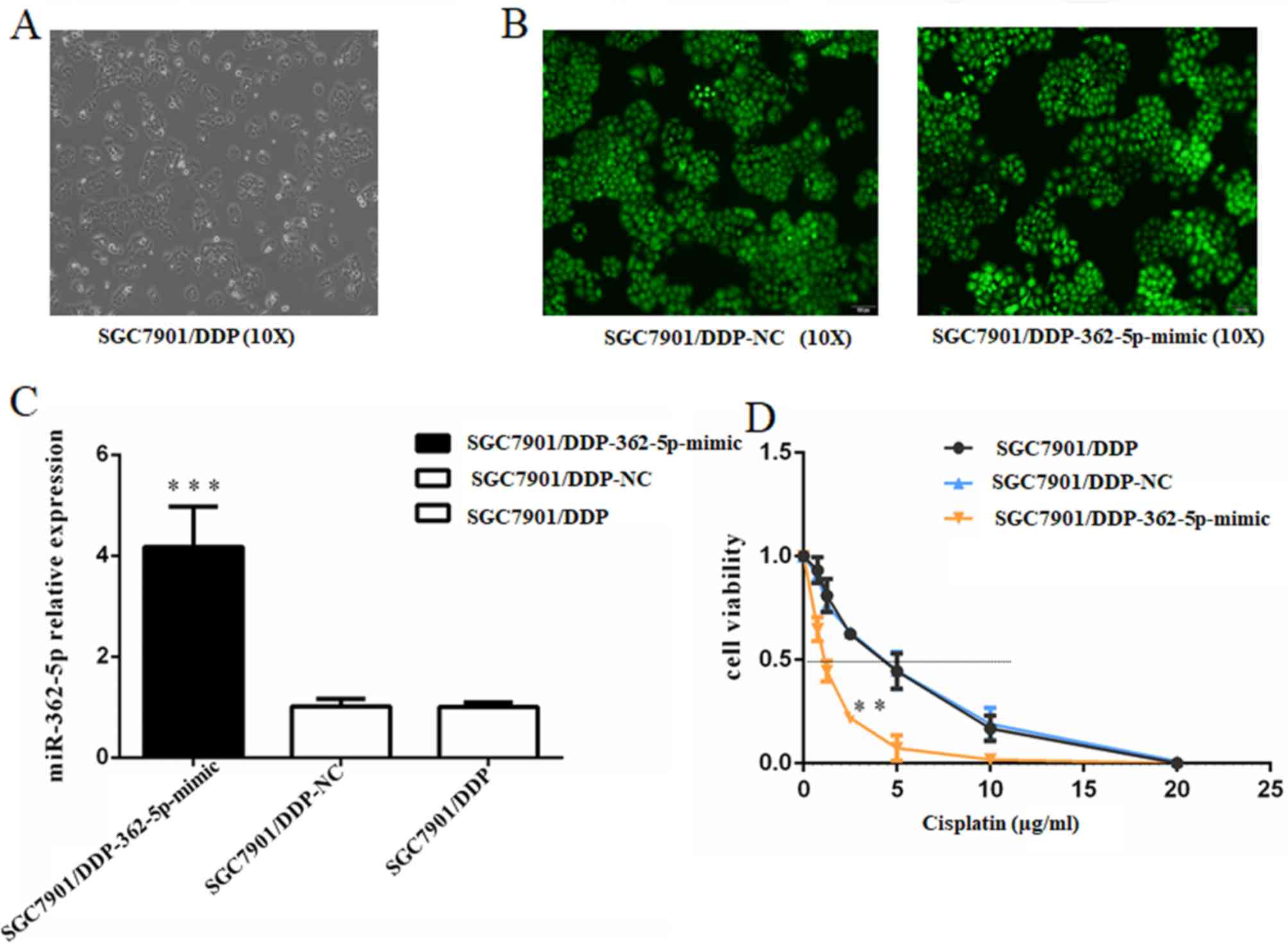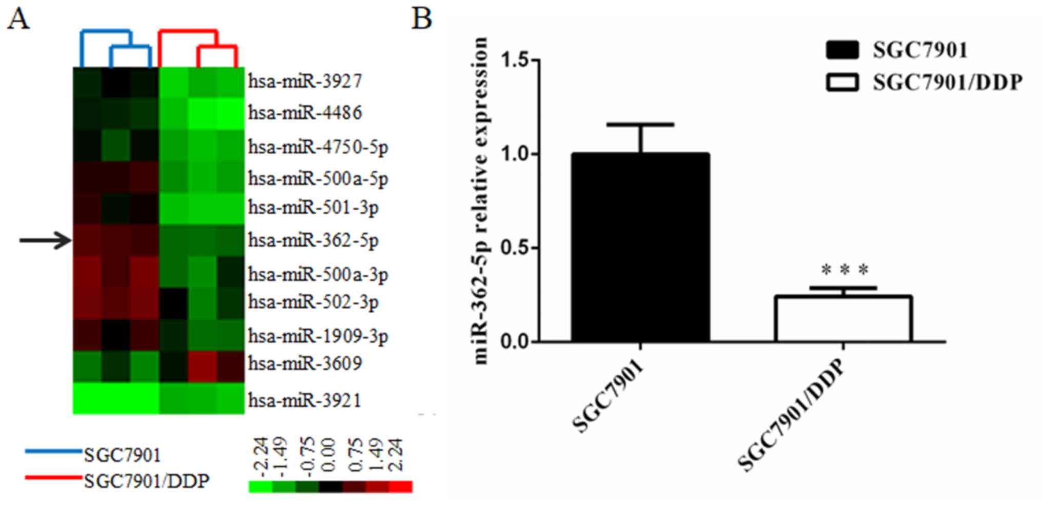 The differential miRNA expression profiles between SGC7901/DDP cells and SGC7901 cells were obtained by miRNA microarray analysis. The Affymetrix miRNA GeneChip 4.0 was used to scan and quantify the signal intensity of probes of 1,316 human mature miRNAs on the chips for the two cell lines. The results indicated that 48 miRNAs were significantly differentially expressed (>2-fold) in SGC7901/DDP cells relative to the parental cells, including 19 upregulated miRNAs and 29 downregulated miRNAs. miR-362-5p was revealed to be downregulated in SGC7901/DDP cells and was selected for further research to determine its function in the cisplatin resistance of GC cells. Cluster analysis was performed with Cluster 3.0 software (Fig. 1A). To study the potential effects of miRNA-362-5p on the cisplatin resistance of GC, the difference in miR-362-5p expression between SGC7901 cells and SGC7901/DDP cells was determined by RT-qPCR. The results revealed that the expression level of miR-362-5p was significantly lower in SGC7901/DDP cells compared with expression in SGC7901cells (P<0.01; Fig. 1B). These results suggested that reduced expression of miR-362-5p may be associated with cisplatin resistance in SGC7901/DDP cells.