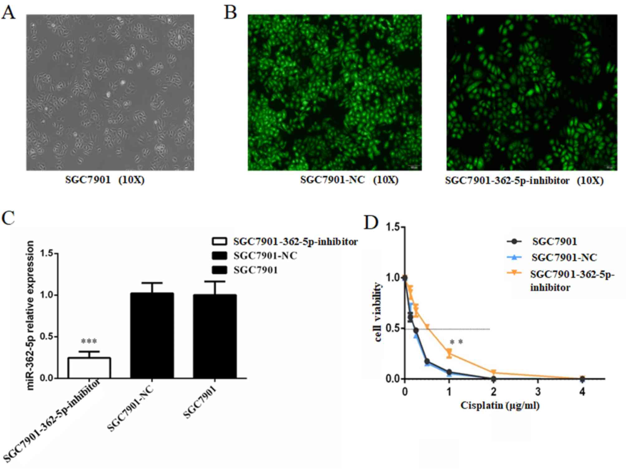 Based on the aforementioned results, the effects of miR-362-5p inhibition on cisplatin-induced cytotoxicity in cisplatin-sensitive SGC7901 cell line was further investigated. SGC7901 cells were transfected with lentiviral plasmids carrying miR-362-5p inhibitor or its negative control. The transfected cells were screened with puromycin and then observed for fluorescence (Fig. 3A and B). The data from RT-qPCR revealed that the miR-362-5p inhibitor significantly decreased the expression level of miR-362-5p in SGC7901 cells compare with negative control and blank control (P<0.001; Fig. 3C), which confirmed that the cells were successfully transfected. Subsequently, a range of concentrations of cisplatin was applied to the cultures and the IC50 for cisplatin was estimated based on cell viability. Cisplatin sensitivity was significantly attenuated in SGC7901 cells transfected with the miR-362-5p inhibitor compared with the control SGC7901-NC and SGC7901 cells (IC50, 0.676±0.042 vs. 0.286±0.025 and 0.300±0.009 µg/ml, respectively; P<0.01; Fig. 3D). These data verified that downregulation of miR-362-5p enhances the cisplatin resistance of cisplatin-sensitive GC cell lines.