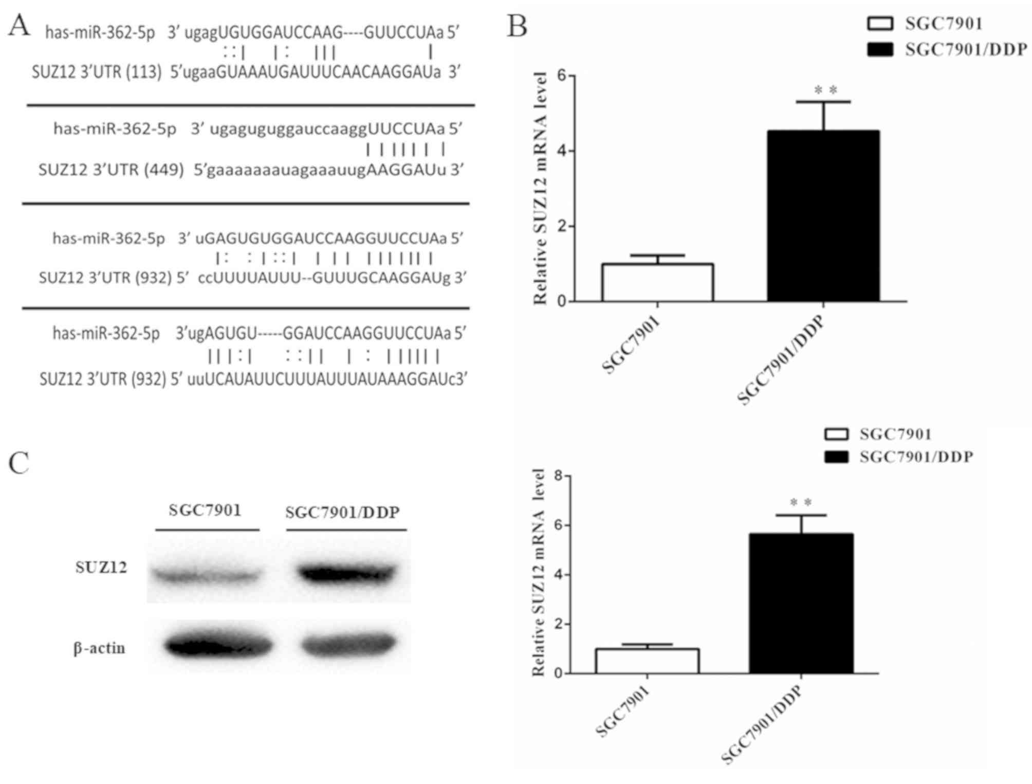 The present study investigated the potential function of miR-362-5p in vitro and aimed to further understand its underlying mechanism in cisplatin-resistant GC cells. In addition, this study defined the molecular mechanism of SUZ12. These findings may provide novel insights into the tumor biology of GC.