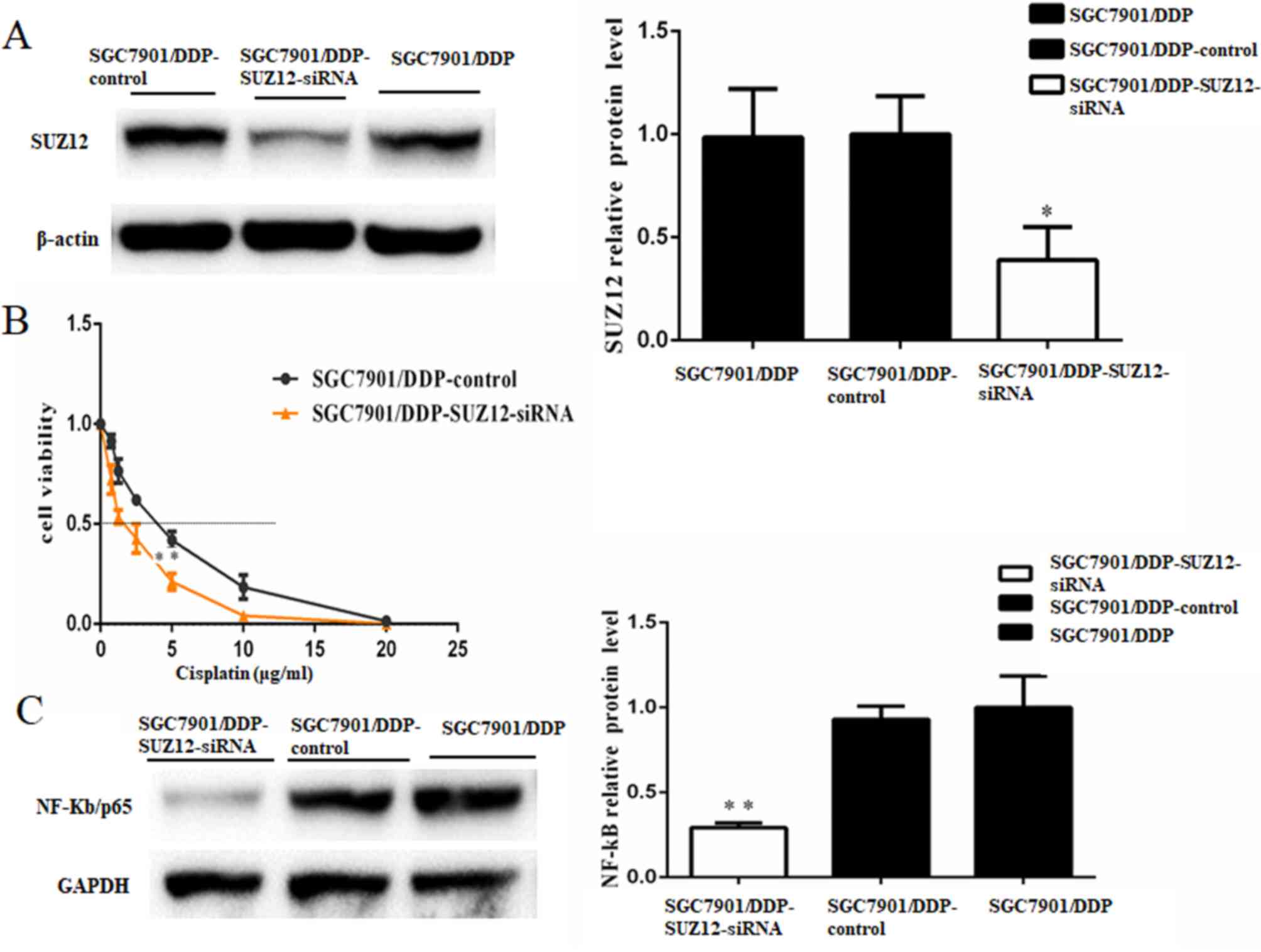 To study the role of SUZ12, si-SUZ12 was used to knock down SUZ12 expression in SGC7901/DDP cells, and the protein expression level of SUZ12 was significantly suppressed (Fig. 5A). MTT assays confirmed that knockdown of SUZ12 in SGC7901/DDP cells treated with cisplatin for 48 h significantly decreased cell survival status (IC50, 2.569±0.479 µg/ml in SGC7901/DDP-SUZ12-siRNA cells vs. 5.097±0.629 µg/ml in SGC7901/DDP cells; P<0.01; Fig. 5B). Therefore, downregulation of SUZ12 enhanced the cisplatin sensitivity of SGC7901/DDP cells. SUZ12 has been demonstrated to act as a positive regulator of NF-κB signaling (20). In the present study, western blot analysis revealed that the NF-κB/p65 protein levels were significantly decreased following SUZ12-knockdown compared with the control group (Fig. 5C).