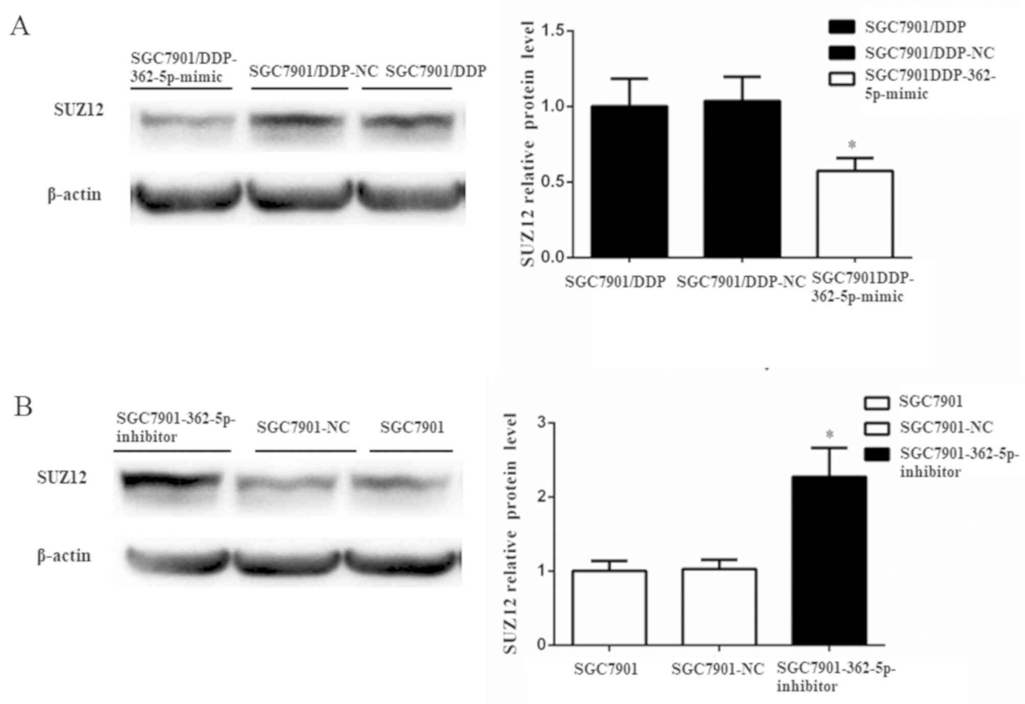 Subsequently, the changes in the expression of SUZ12 protein were further evaluated by western blot analysis after the modulation of miR-362-5p expression. SUZ12 protein expression was significantly reduced in SGC7901/DDP cells transfected with miR-362-5p mimic compared with those transfected with its negative control (Fig. 6A). Additionally, elevated expression of SUZ12 protein was detected following the downregulation of miR-362-5p in SGC7901 cells (Fig. 6B). Taken together, the results of the present study demonstrated that miR-362-5p may modulate cisplatin resistance by targeting SUZ12.