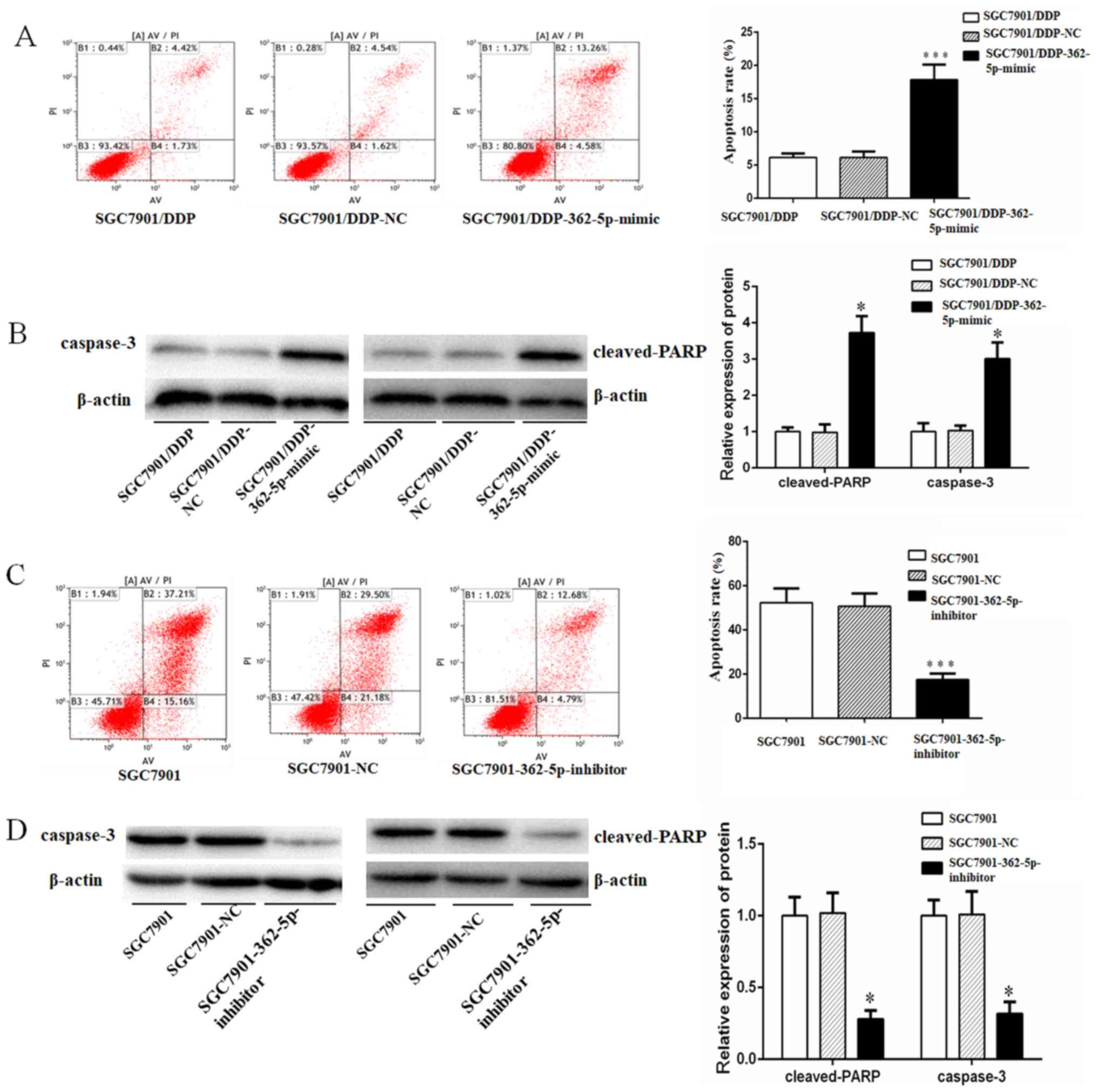 A previous study has demonstrated that the development of chemotherapy resistance in a variety of cancer types is associated with decreased susceptibility to drug-induced apoptosis (21). Therefore, it was hypothesized that miR-362-5p may also serve a role in the cisplatin resistance of GC cells through the modulation of apoptosis. To test this hypothesis, cisplatin-induced apoptosis in SGC7901 and SGC7901/DDP cells transfected with miR-362-5p negative control, mimic or inhibitor, as well as untransfected cells, was quantified by flow cytometry. Additionally, the protein expression of apoptotic markers caspase-3 and cleaved PARP was determined by western blotting. The activation of caspase-3 and its downstream target PARP mediate apoptosis by chromatin condensation and DNA fragmentation (22). Following 48-h treatment with cisplatin at a final concentration of 0.8 µg/ml, the SGC7901/DDP cells overexpression miR-362-5p exhibited significantly higher apoptotic rates and expression levels of caspase-3 and cleaved-PARP compared with the control cells (Fig. 7A and B). Furthermore, following 48-h treatment with cisplatin at a final concentration of 0.3 µg/ml, the SGC7901 cells transfected with miR-362-5p inhibitor displayed significantly lower cisplatin-induced apoptosis, and expression levels of caspase-3 and cleaved-PARP compared with the control cells (Fig. 7C and D). Taken together, the results of the present study demonstrated that miR-362-5p may modulate the cisplatin resistance of human GC in part by sensitizing cells to cisplatin-induced apoptosis.