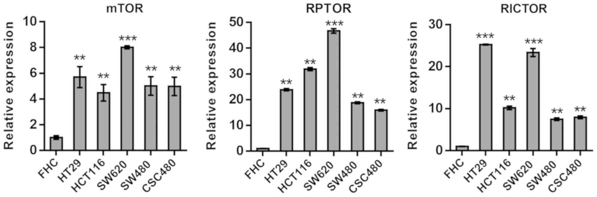 To assess alterations of the mTOR pathway in CRC cells, mTOR, RPTOR and RICTOR expression levels were investigated in five human CRC cell lines, HT29, HCT116, SW620, SW480 and CSC480, using RT-qPCR. The gene GAPDH was used as a reference. The comparison of results from mTOR, RPTOR and RICTOR expression revealed significantly (P<0.01) elevated mRNA expression levels in all cell lines compared with normal FHC cells (Fig. 1).