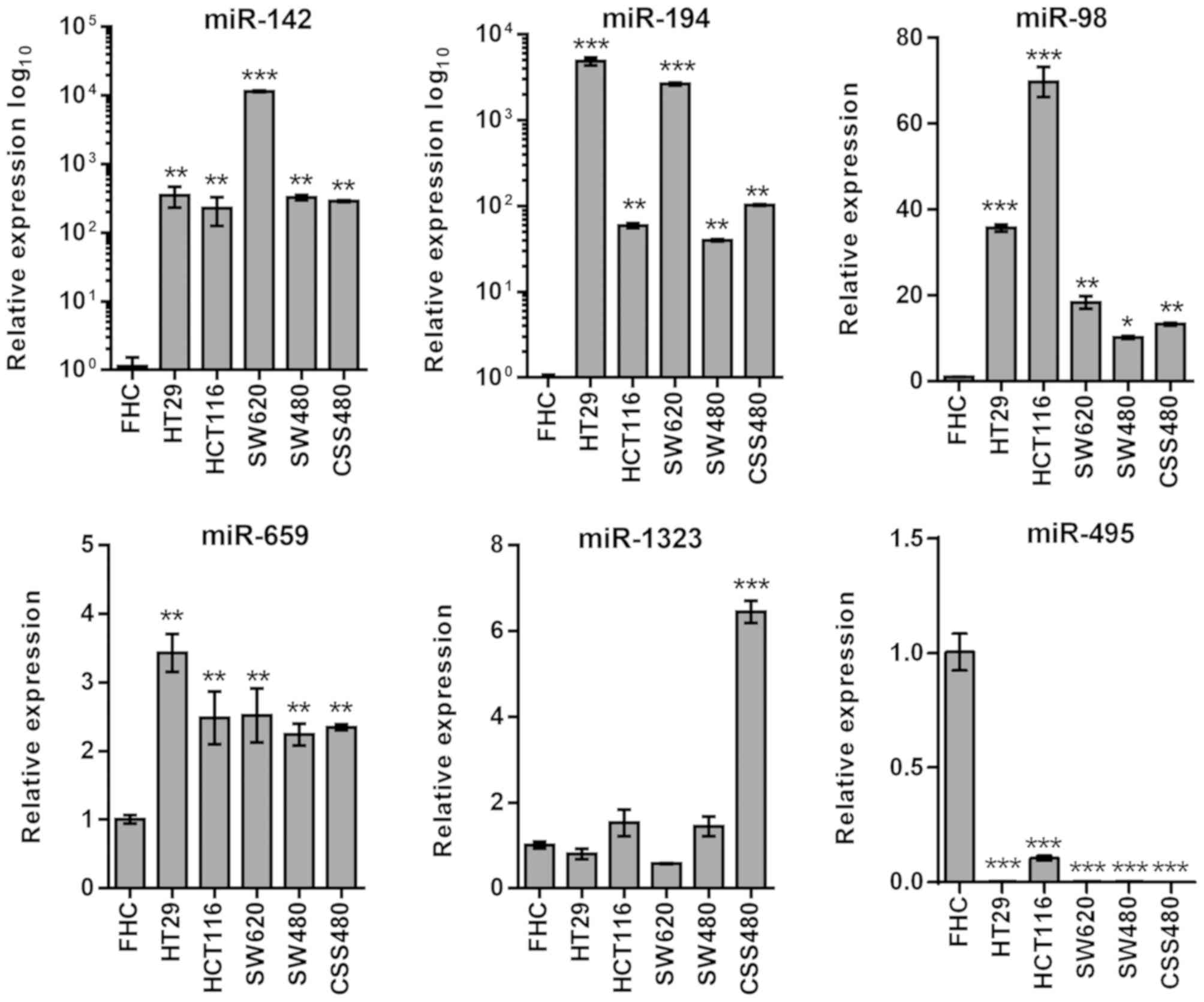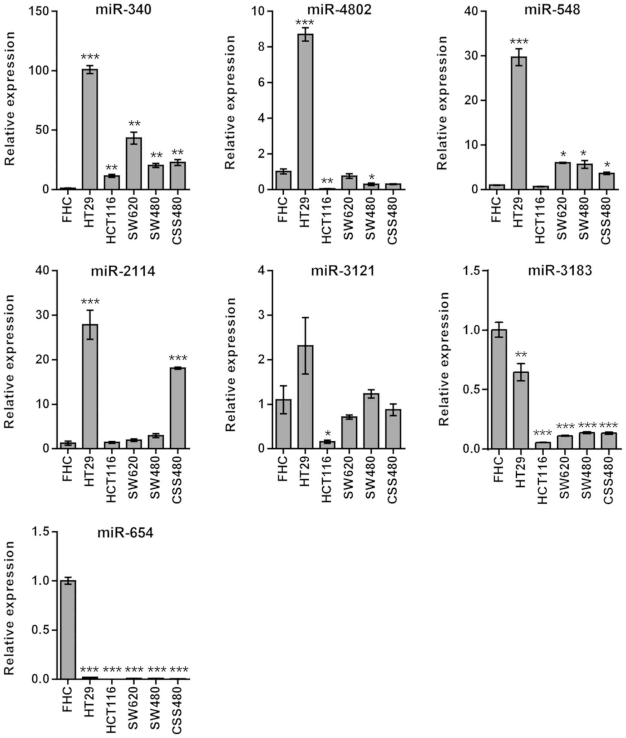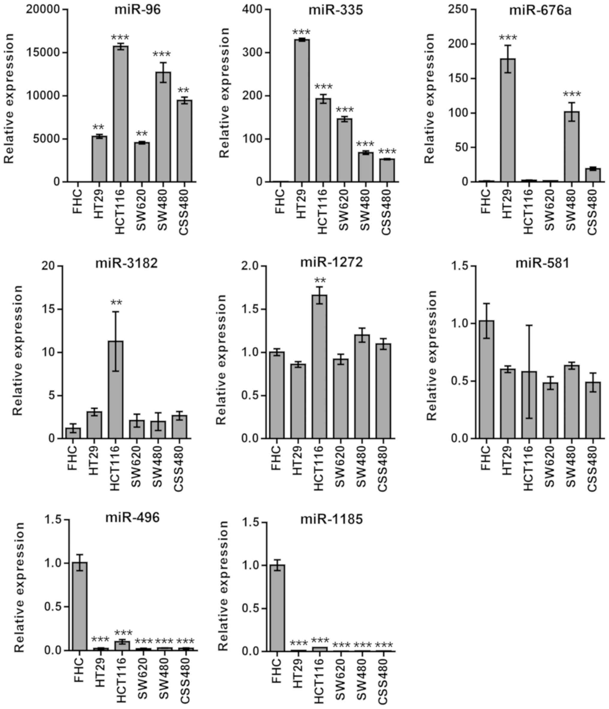Next, the most significant candidates of miRNAs were selected, as predicted by the bioinformatics analysis, to target the genes of interest for further confirmatory studies. A selection of CRC cell lines, as well as the control (FHC), were used to examine whether miRNAs were associated with transcriptional expression of their relevant target gene and to identify miRNAs involved in CRC cells. Based on the results from the bioinformatics analysis, candidate miRNAs that were identified to be associated with each gene were assessed using qPCR.