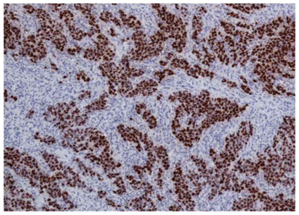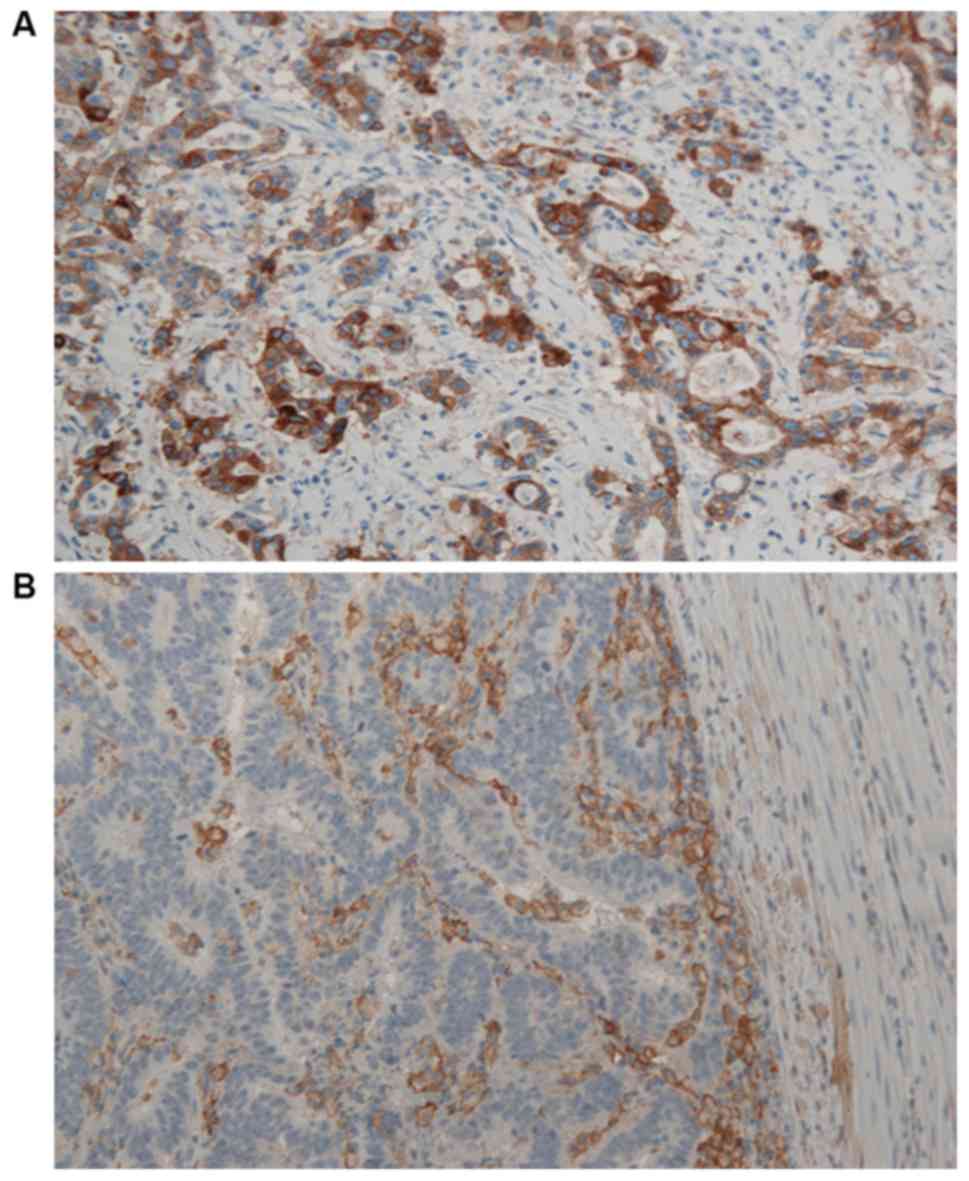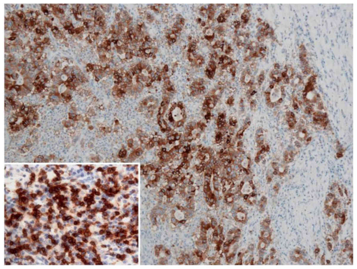 Furthermore, certain studies consider cytoplasmic positivity for the purpose of evaluating positive cases (46,47). By contrast, it has repeatedly been stressed that membrane positivity is the only indicator of a receptor's presence (48). Unlike the strict immunohistochemical evaluation of HER2 in mammary and gastric carcinomas, to the best of our knowledge, precise guidelines do not exist for PD-L1, including for the evaluation of PD-L1 expression on biopsy material. However, the prevalent focal pattern of PD-L1 suggests immunohistochemical analysis should be performed on multiple biopsies to avoid underestimating the expression of PD-L1.