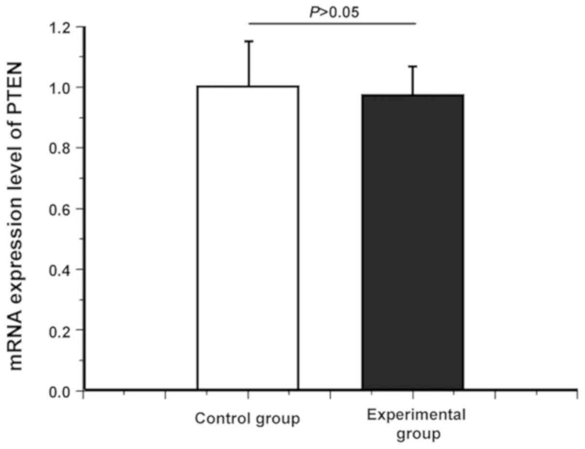 Whether there was a difference in the PTEN mRNA level between healthy subjects and OSCC patients was detected via quantitative PCR. As shown in Fig. 1, there was no significant difference in the PTEN mRNA expression level between healthy subjects and OSCC patients (P>0.05), indicating that the PTEN mRNA level had no difference between healthy subjects and OSCC patients.