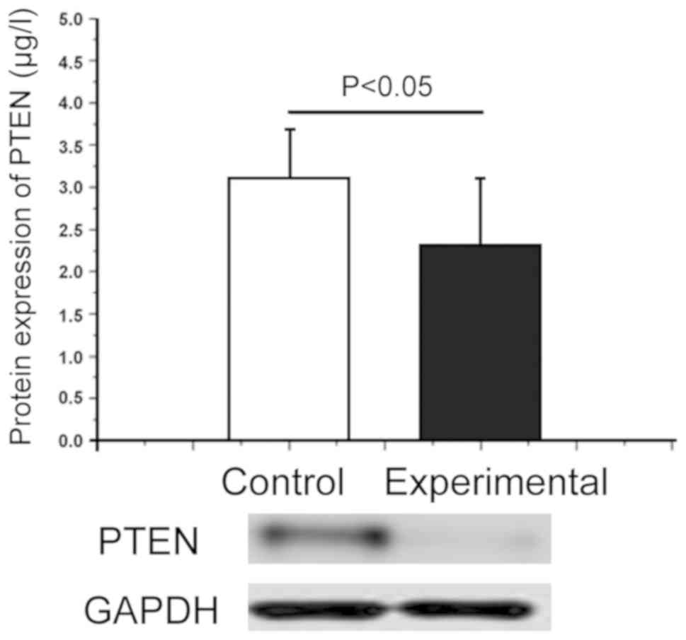 Western blot analysisThe total protein was extracted from the sample using the AXYGEN animal cell protein extraction kit. According to the instructions 0.5 mg of different research samples were accurately taken and quantified via Coomassie blue staining. After treatment, 20 µl samples were taken for sodium dodecyl sulfate polyacrylamide gel electrophoresis (10%). Then the protein was transferred onto a polyvinylidene difluoride membrane, sealed for 2 h at 4°C. Bull serum albumin (BSA), blocking buffer (5%) was used as the blocking reagent. Then the membrane was incubated with the primary antibody (shown below) at 20°C for 2 h, incubated again with the secondary antibody at room temperature for 2 h, and washed with eluent 5 times (10 min/time). Rabbit monoclonal anti-PTEN antibody (cat. no. ab32199; dil, 1:500); rabbit polyclonal GAPDH antibody (cat. no. ab37168; dil, 1:500) and secondary goat anti-rabbit (HRP) IgG antibody (cat. no. ab6721; dil, 1:2,000) were all purchased from Abcam. Finally, the color was developed using the developing solution.