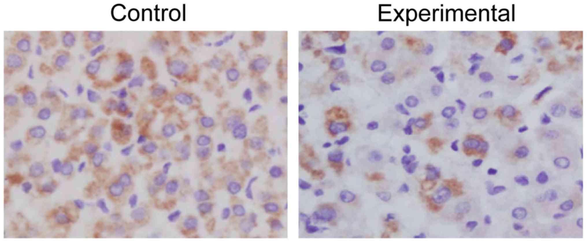 The following experimental reagents were used: Fluorescence quantitative polymerase chain reaction (PCR) reagent and ribonucleic acid (RNA) extraction reagent were purchased from Takara and animal cell protein extraction kit was purchased from Thermo Fisher Scientific, Inc. Streptomycin-peroxidase (S-P) kit and corresponding antibodies were purchased from Thermo Fisher Scientific, Inc. Genome extraction kit was purchased from AXYGEN and other reagents and consumables were purchased from Sangon Biotech Co., Ltd.