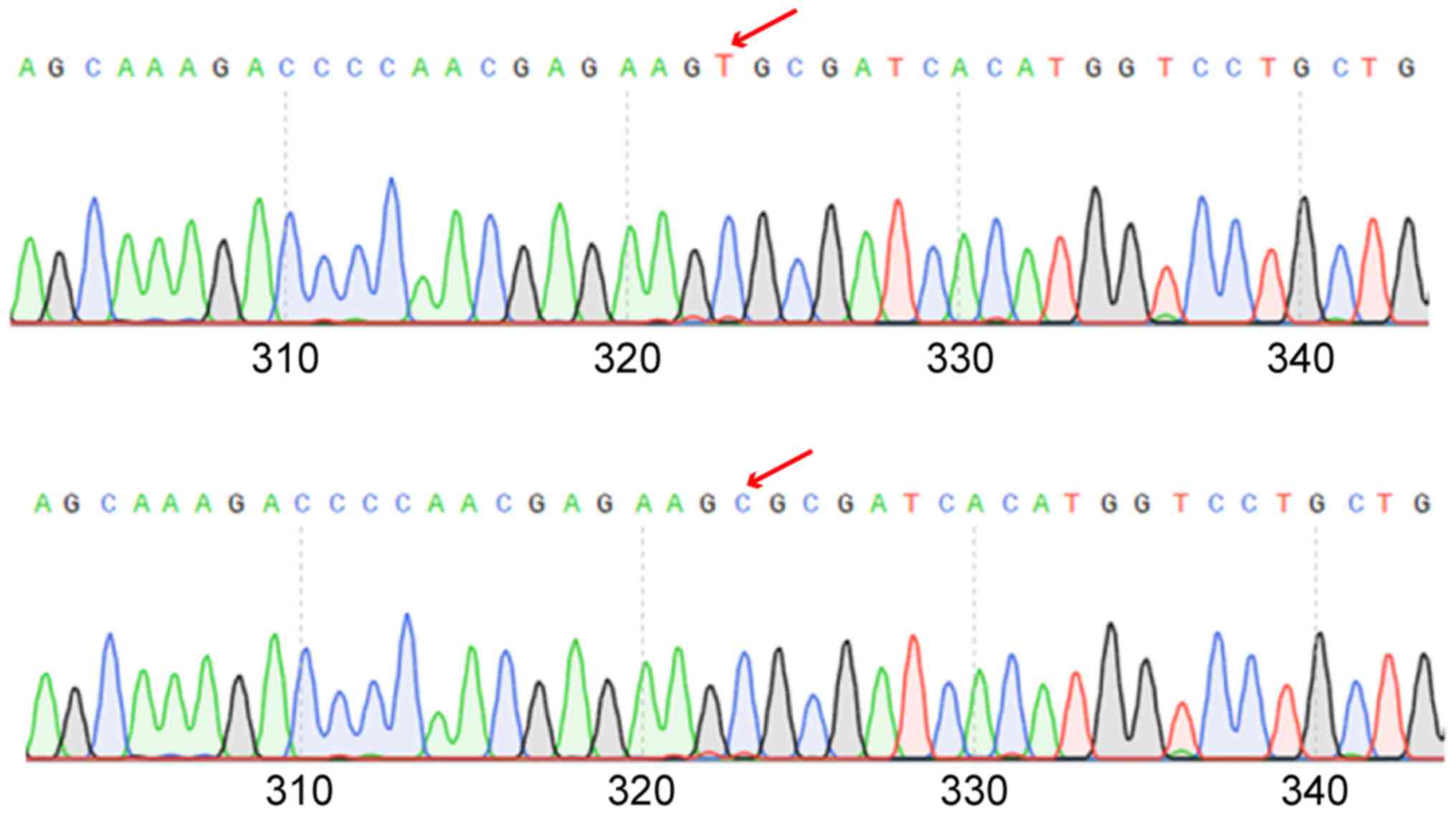 The genome extracted in the control and experimental groups was used as a template, and then the rs9651495 was amplified and sequenced. It was found that there was a significant difference in the rs9651495 genotype between the two groups (P<0.05) (Fig. 4). The C/C genotype frequency of rs9651495 in OSCC patients (50.15%) was significantly higher than that in healthy subjects (23.71%), showing a significant difference (P<0.05). The C/T genotype frequency of rs9651495 had no significant difference between the two groups (18.52 vs. 19.01%) (P>0.05). The T/T genotype frequency of rs9651495 in OSCC patients (31.33%) was obviously lower than that in healthy subjects (57.19%), displaying a significant difference (P<0.05), suggesting the correlation between rs9651495 locus polymorphism of PTEN gene and OSCC (Table V).
