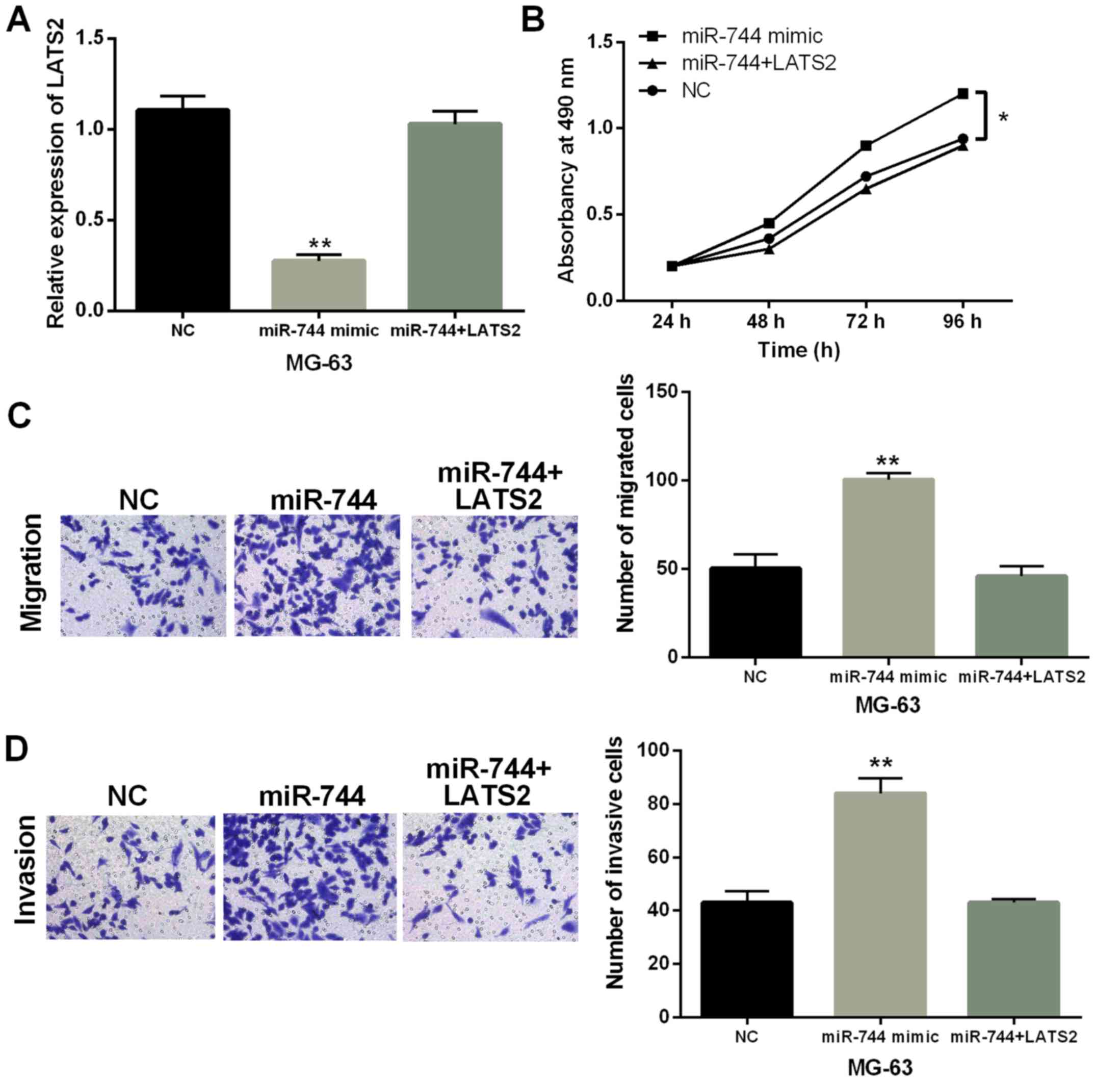 Finally, MG-63 cells with miR-744 mimics were transfected with LATS2 vector to explore their interaction in OS. We found that miR-744 mimics mediated reduction of LATS2 expression which was recovered by LATS2 vector (Fig. 5A). Functionally, promotion of cell proliferation induced by miR-744 overexpression was impaired by upregulation of LATS2 (P<0.01, Fig. 5B). Similarly, promotion of cell migration and invasion regulated by miR-744 was also weakened by LATS2 upregulation (P<0.01, Fig. 5C and D). Combining these results, miR-744 was considered to accelerate OS progression through targeting LATS2.