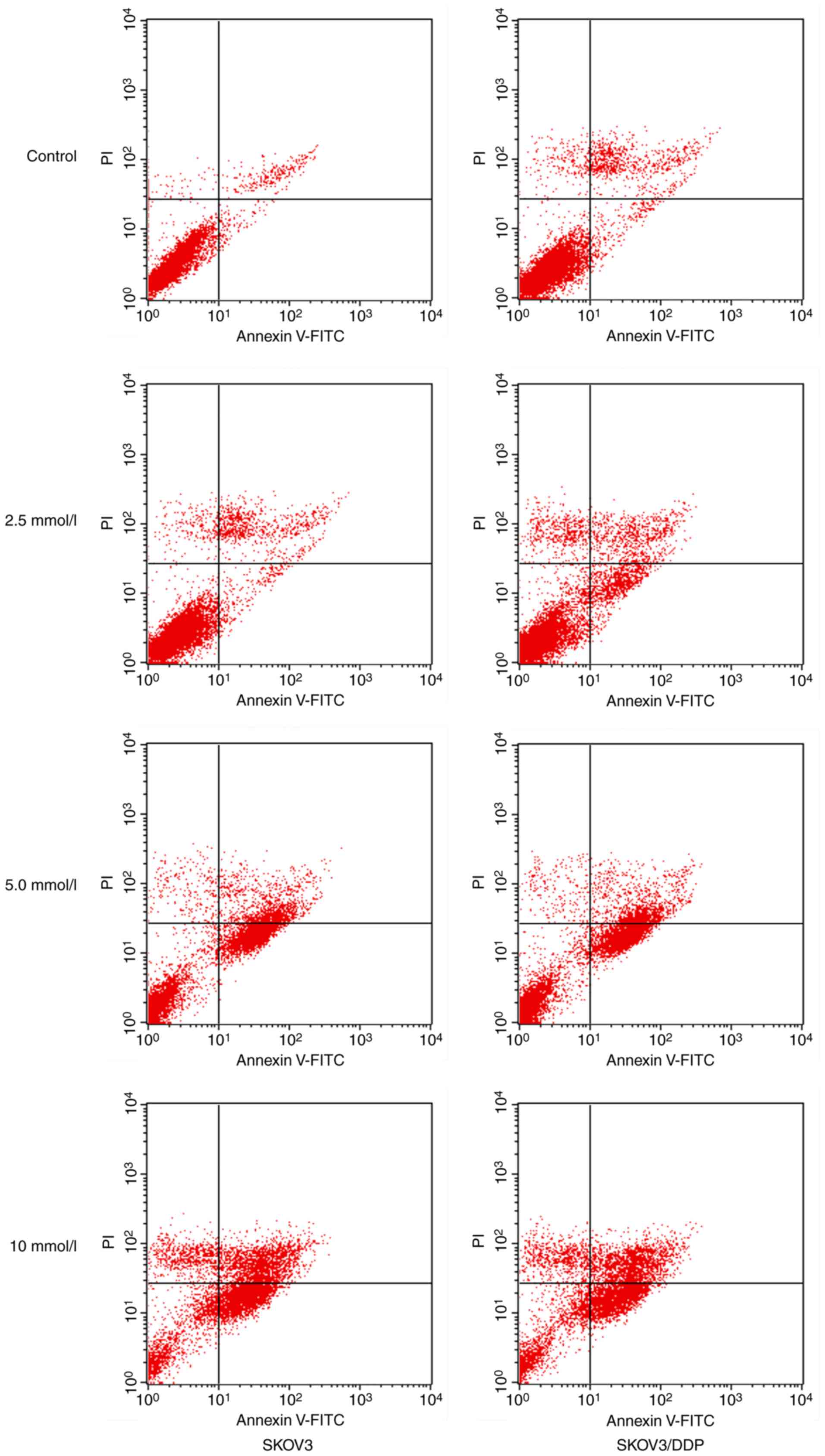 Table III.Apoptotic rates detected using flow cytometry in SKOV3 and SKOV3/DDP cells following incubation with metformin for 48 h. |