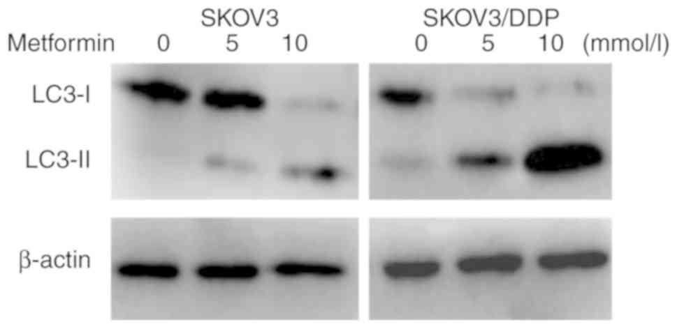 LC3 possesses two forms, including an 18-kDa cytosolic protein (LC3-I) and a processed 16-kDa form (LC3-II). The expression levels of LC3-II and the ratio of LC3-II/LC3-I represent autophagic activity (11). Therefore, LC3-I and LC3-II were detected in SKOV3 and SKOV3/DDP cells incubated with different concentrations of metformin for 48 h using western blot analysis. As indicated in Fig. 3, the expression levels of LC3-II in SKOV3/DDP cells were higher than those in SKOV3 cells, indicating that the autophagic activity of drug-resistant cells was increased compared with that of the parental cells. Metformin may induce autophagy in ovarian cancer cells. Following incubation with 10 mmol/l of metformin for 48 h, the expression levels of LC3-II protein were significantly increased in SKOV3 and SKOV3/DDP cells, and the expression levels in SKOV3/DDP cells were higher compared with in SKOV3 cells (Fig. 4). These results demonstrated that metformin could promoted the autophagy of ovarian cancer cells, and served a crucial role in promoting autophagy in drug-resistant ovarian cancer cells.