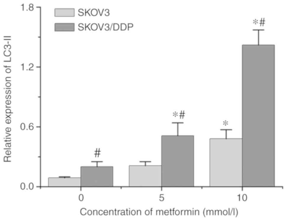 In conclusion, metformin not only induced apoptosis of ovarian cancer parental SKOV3 and drug-resistant SKOV3/DDP cells, but also enhanced autophagic activity in SKOV3/DDP cells. Therefore, the fact that metformin can sensitize drug-resistant ovarian cancer cells to chemotherapeutic agents may indicate an association with inducing autophagy. Although the specific underlying molecular mechanism remains unclear in the present study, metformin is a potential antitumor drug, particularly for the treatment of drug-resistant ovarian cancer. The results of the present study will be verified in future studies that include additional ovarian cancer cell lines and animal models.