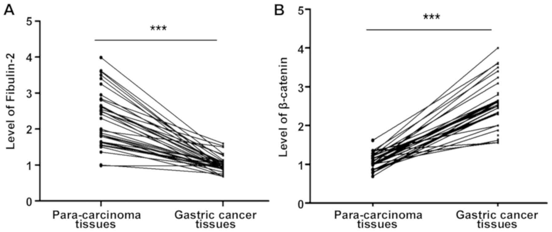 β-catenin, a protein with dual function, has cell adhesion and signal transmission activity, was first discovered in the study on cell adhesion molecule E-cadherin (7). β-catenin is an indispensable part of the Wnt/β-catenin signaling pathway and plays a key role in the occurrence and development of gastric cancer (8). Previous studies have revealed that there is a direct or indirect regulatory relation between fibulin protein family and β-catenin, both of which exert an important influence on the development of gastric cancer (9).