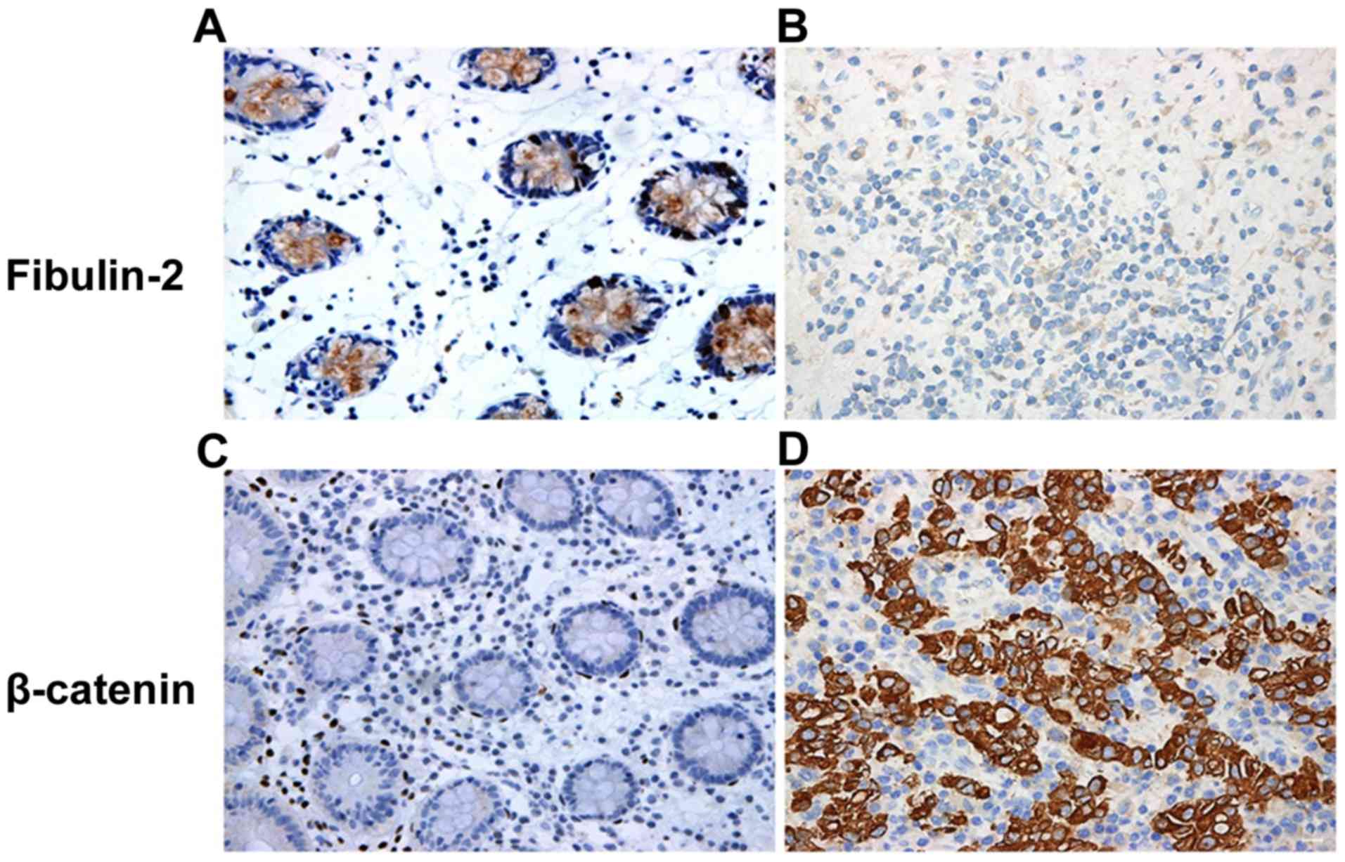 Table II.Expression of fibulin-2 and β-catenin protein in gastric cancer and para-carcinoma tissues. |