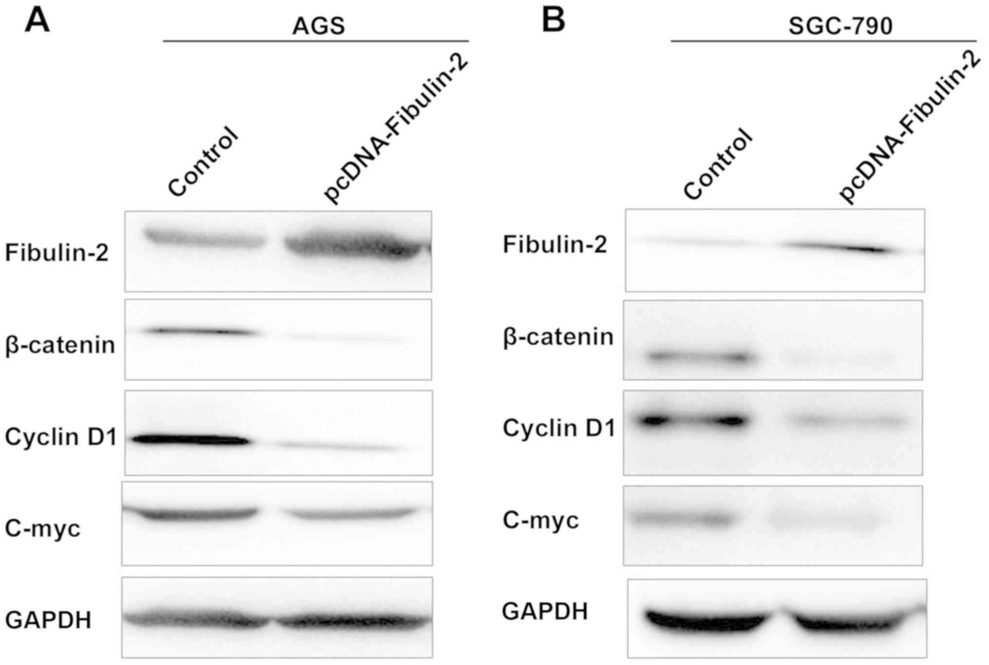 According to literature reports, fibulin-2 expression is low in AGS and SGC-790 cell lines. Therefore, fibulin-2 overexpression plasmid was transfected into the two cells. As shown in Fig. 3, after overexpression of fibulin-2, protein expression of β-catenin, cyclin D1 and c-Myc was obviously downregulated (P<0.05).