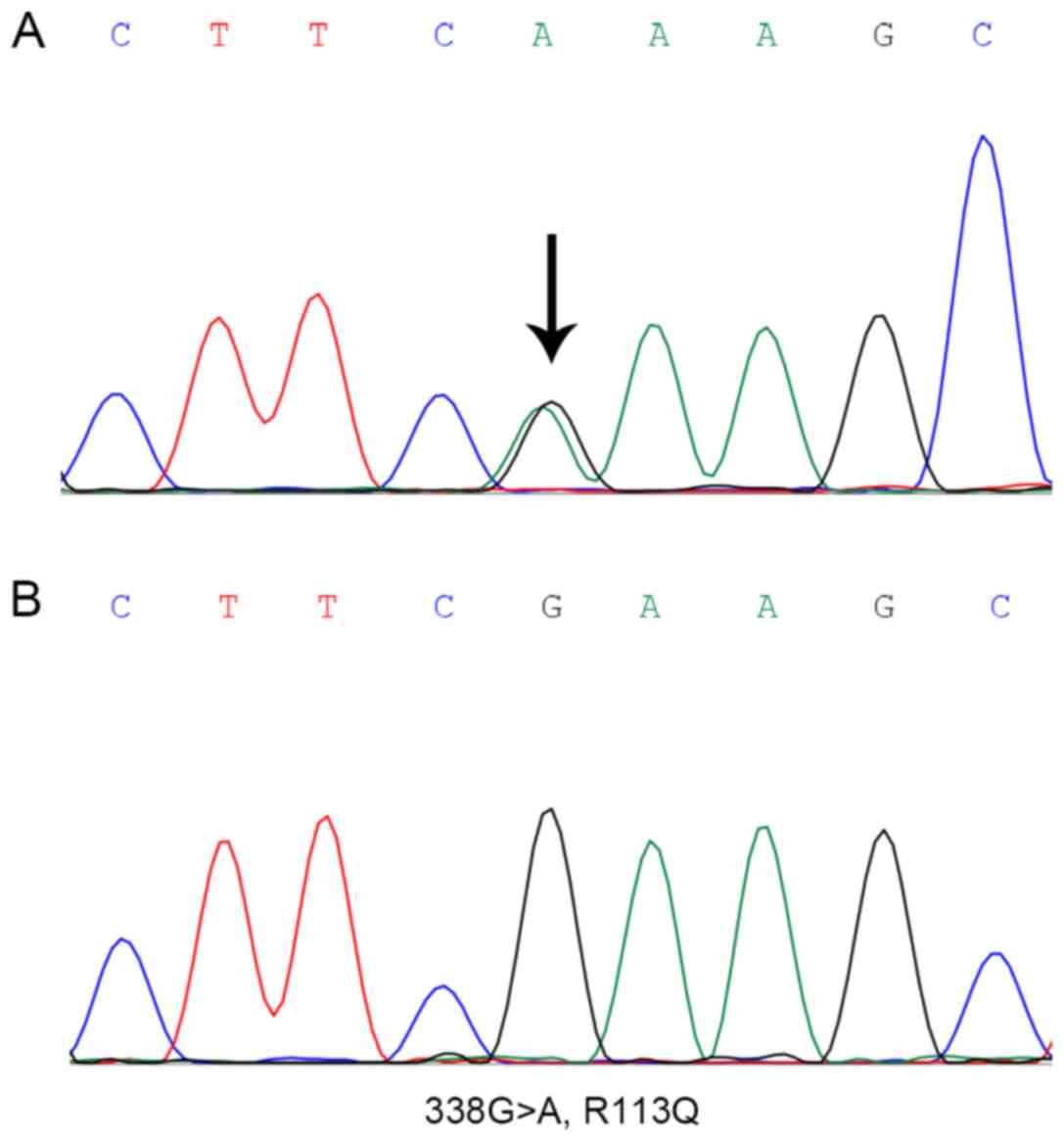 Additionally, the results of the 1,000 Genomes Project indicated that the frequency of occurrence of this allele accounts for 1.9% of the Han people from Beijing and the south of China (Table III), a figure similar to our finding (1.2%). Furthermore, the R113Q allele was present at a lower frequency in Japanese populations and was not detected at all in Europeans (Table III) (21).