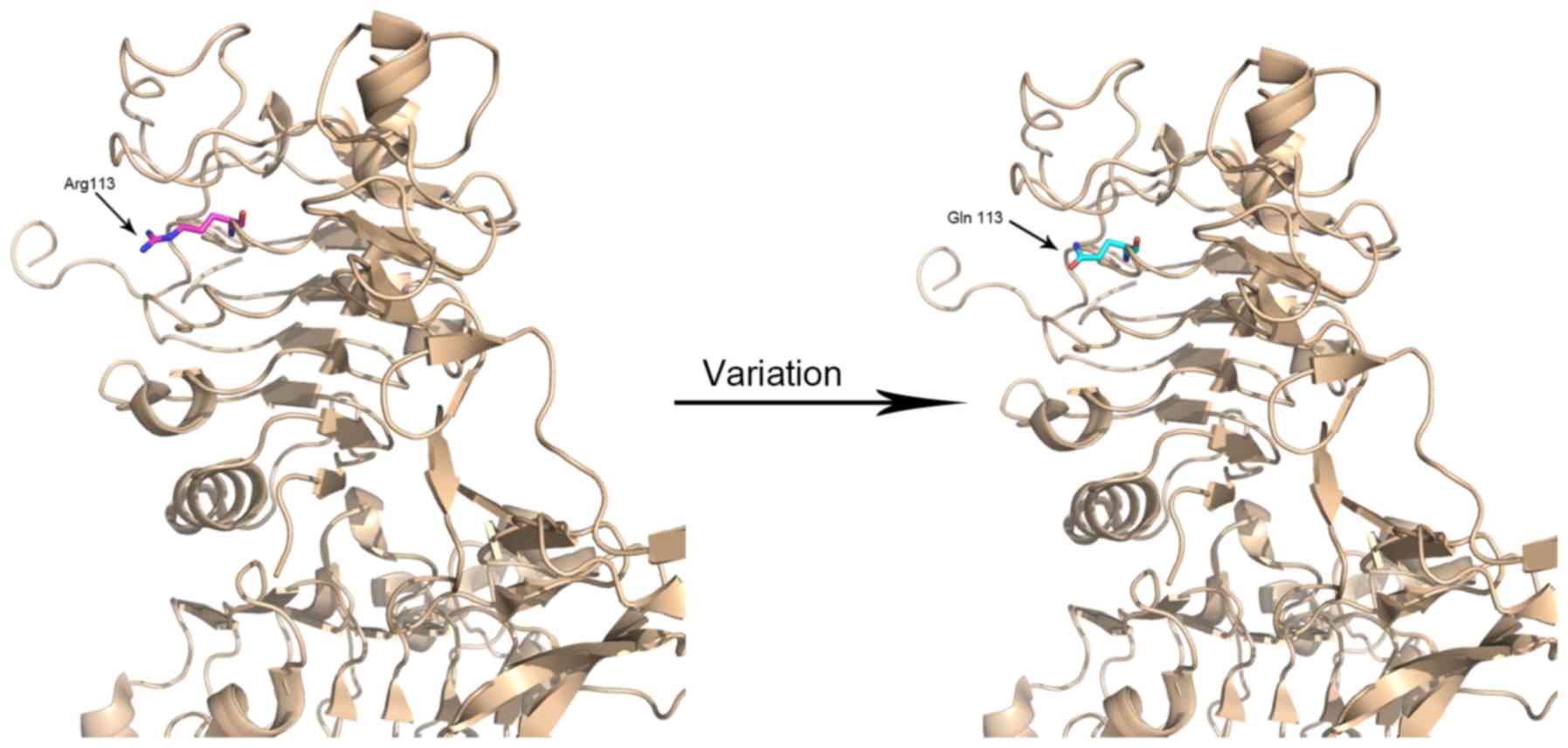 The R113Q variant in the ERBB2 gene was predicted to be involved in the extracellular ligand-binding domain, a domain that is highly conserved in biological evolution. The mutation-induced structural change of the extracellular domain was thus hypothesized to cause a deficit in function. The arginine at residue 113 of ERBB2 was highly conserved among different vertebrates (Fig. 2) where a red box indicates residue 113 of HER2 in each of the vertebrates. Although the predicted effects of the R113Q mutation from four different programs were inconsistent, two of the in silico tools predicted its pathogenicity, although specific details were not provided (Table V). The results of the 3D structure suggested that the alteration of the amino acid at position 113 (Fig. 3) led to a structural change in the side chain of ERBB2. Accordingly, the R113Q variant was predicted to have a potentially damaging effect on the function of the protein, the mechanism of which will be investigated in future studies.