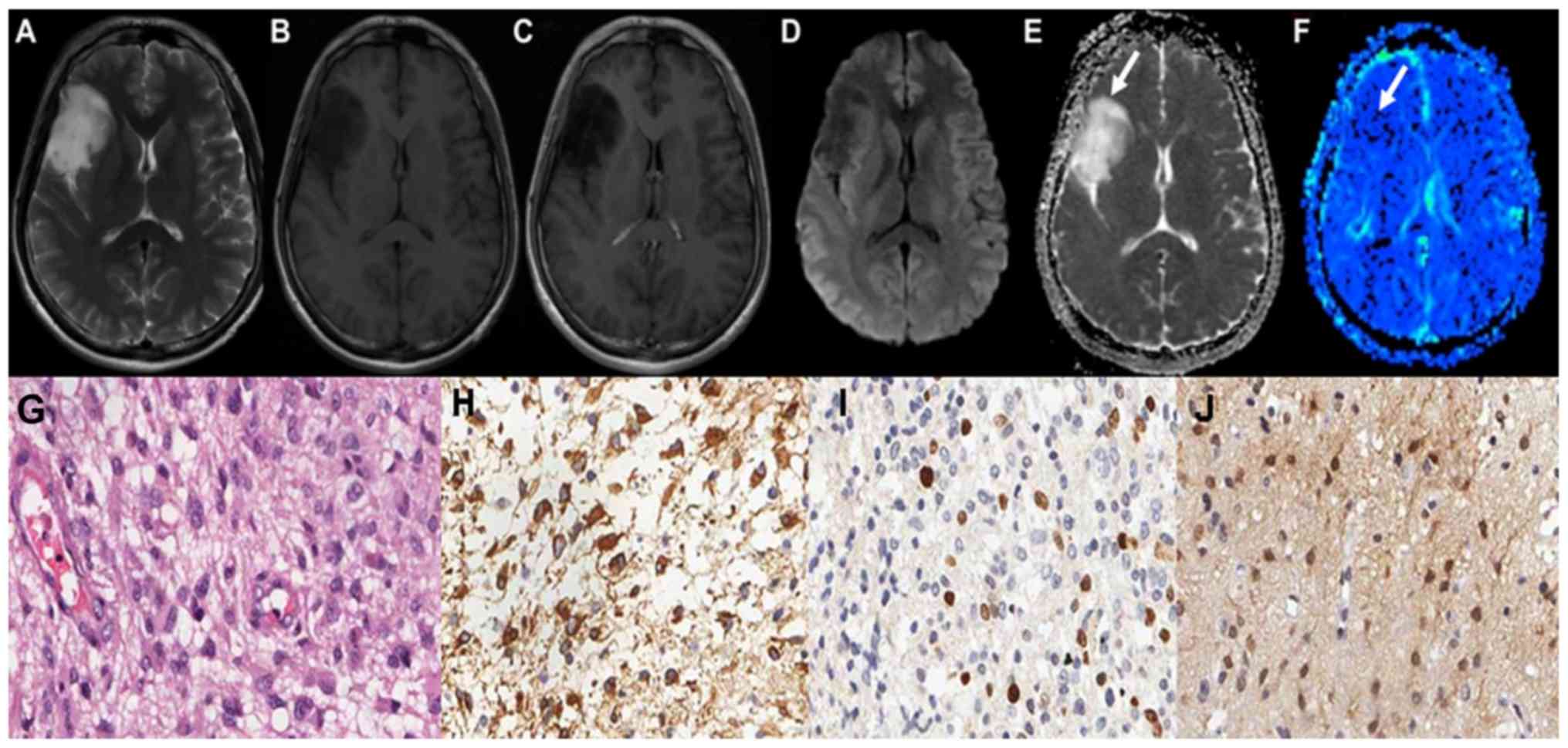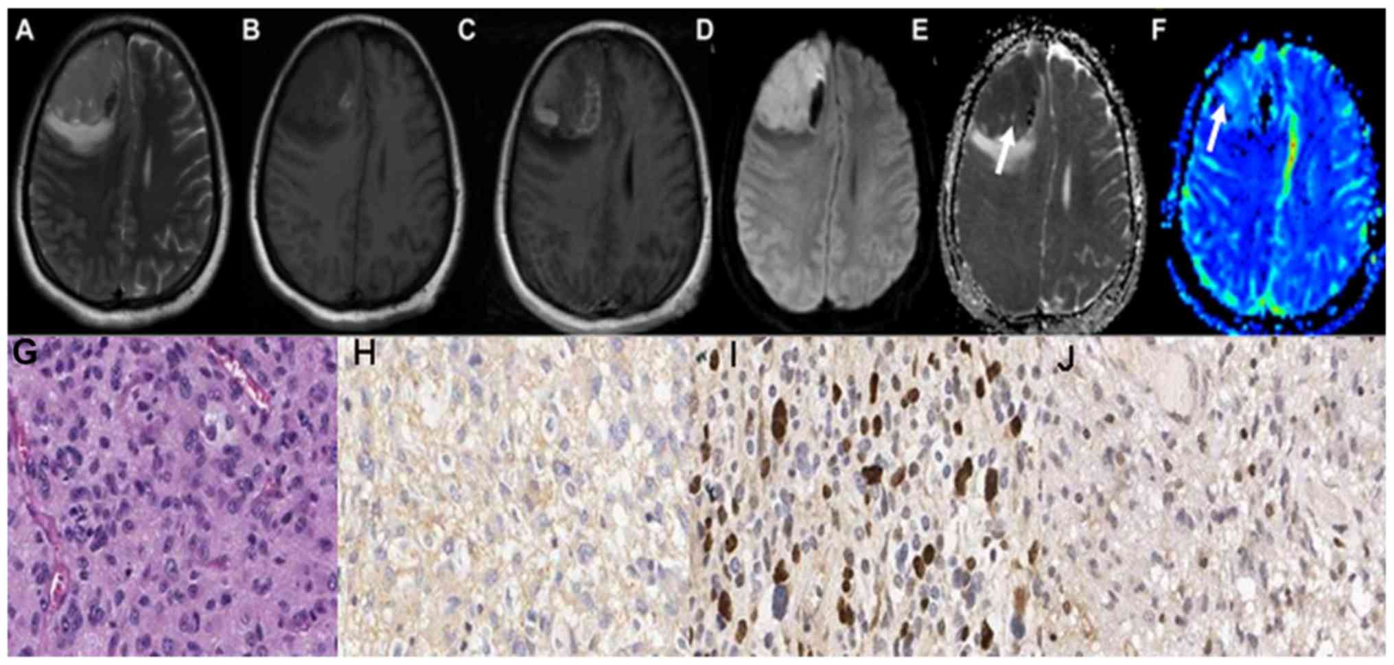 Lee EJ, Lee SK, Agid R, Bae JM, Keller A and Terbrugge K: Preoperative grading of presumptive low-grade astrocytomas on MR imaging: Diagnostic value of minimum apparent diffusion coefficient. AJNR Am J Neuroradiol. 29:1872–1877. 2008. View Article : Google Scholar : PubMed/NCBI