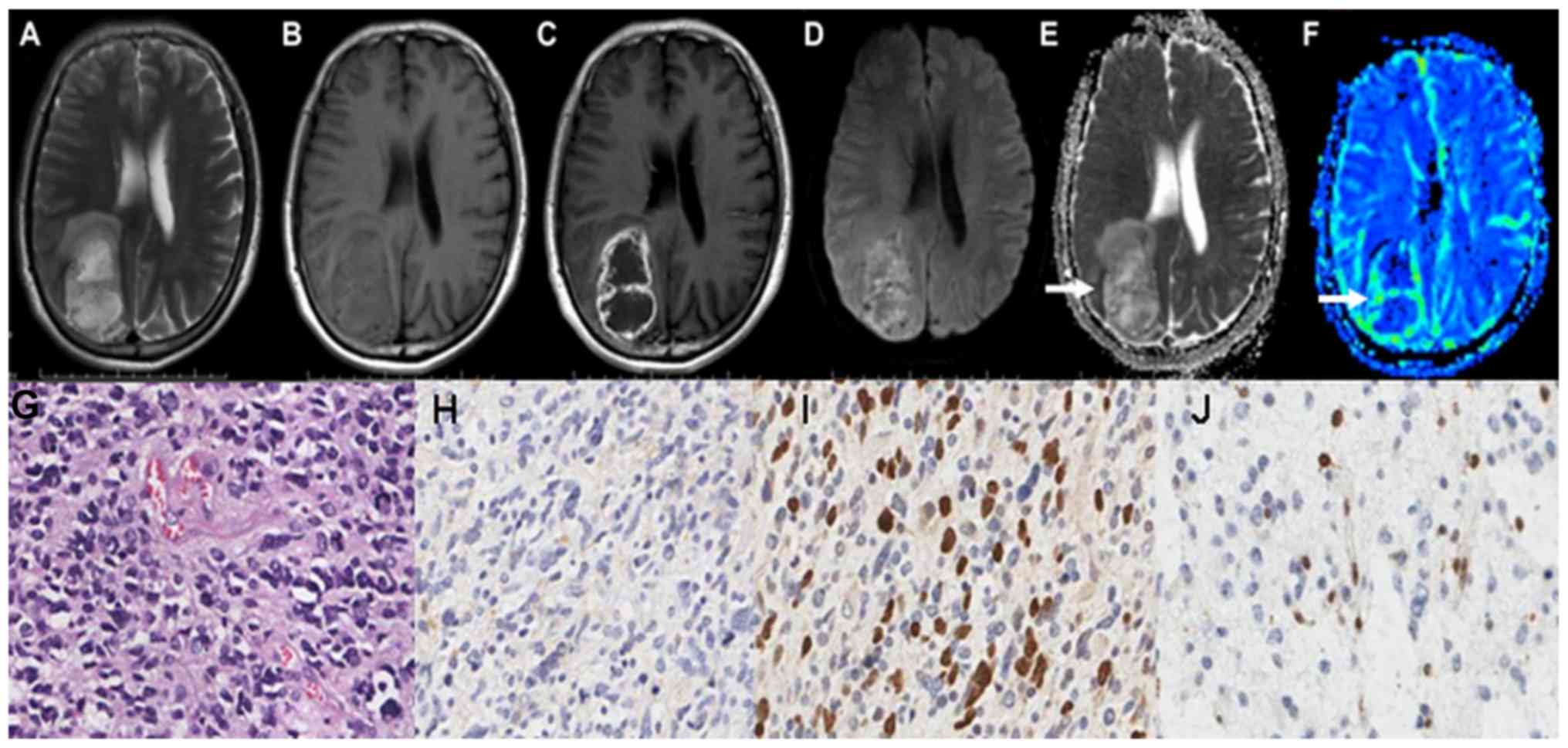 Calli C, Kitis O, Yunten N, Yurtseven T, Islekel S and Akalin T: Perfusion and diffusion MR imaging in enhancing malignant cerebral tumors. Eur J Radiol. 58:394–403. 2006. View Article : Google Scholar : PubMed/NCBI