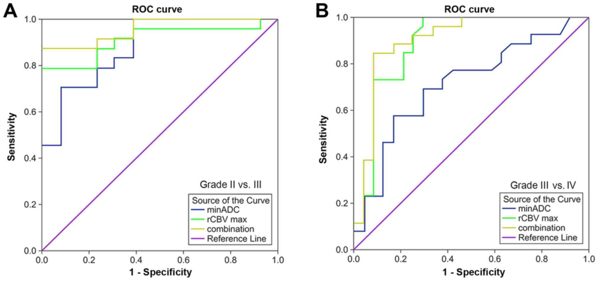 Hakyemez B, Erdogan C, Ercan I, Ergin N, Uysal S and Atahan S: High-grade and low-grade gliomas: Differentiation by using perfusion MR imaging. Clin Radiol. 60:493–502. 2005. View Article : Google Scholar : PubMed/NCBI