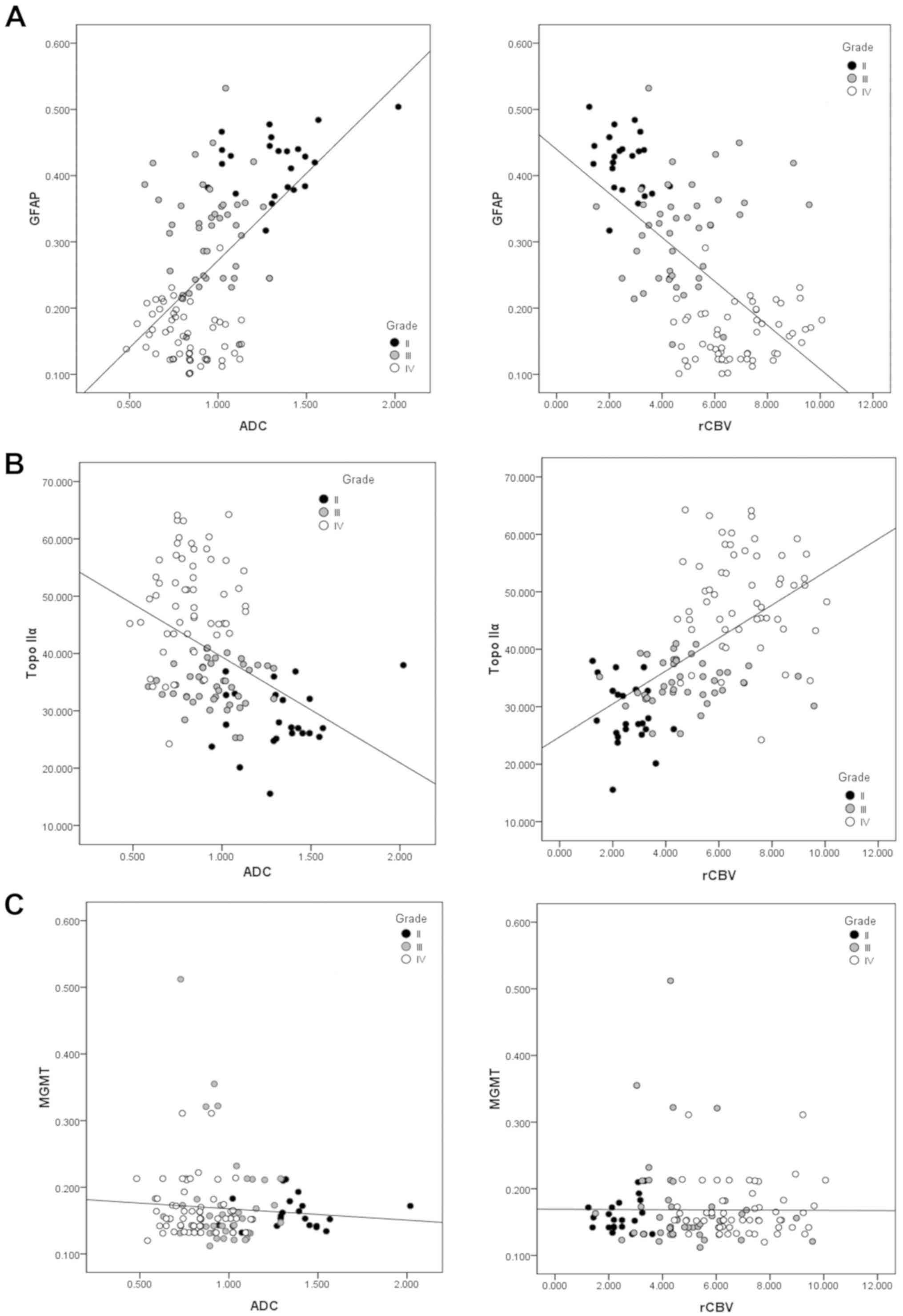 MGMT promoter methylation reflects the sensitivity of chemotherapeutic drugs (temozolomide) to astrocytoma patients. The existence of an association between expression levels of MGMT protein and MGMT promoter methylation remains unknown (26). In the present study, no correlation was observed between values of ADC and rCBV and MGMT protein expression. As aforementioned, this association requires additional study.